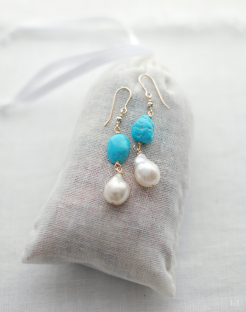 クリアブルーのターコイズはくっきりとした発色でバロックパールの穏やかなムードとのバランスがよく、大人の女性に似合うピアスになりました。ダークな色彩のニットからリネンまで、年間を通して幅広くコーディネートを楽しんでいただけるジュエリーです。