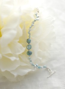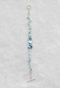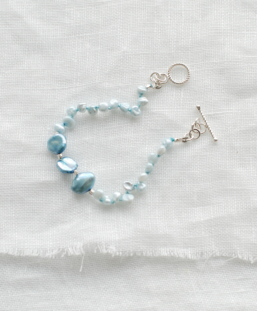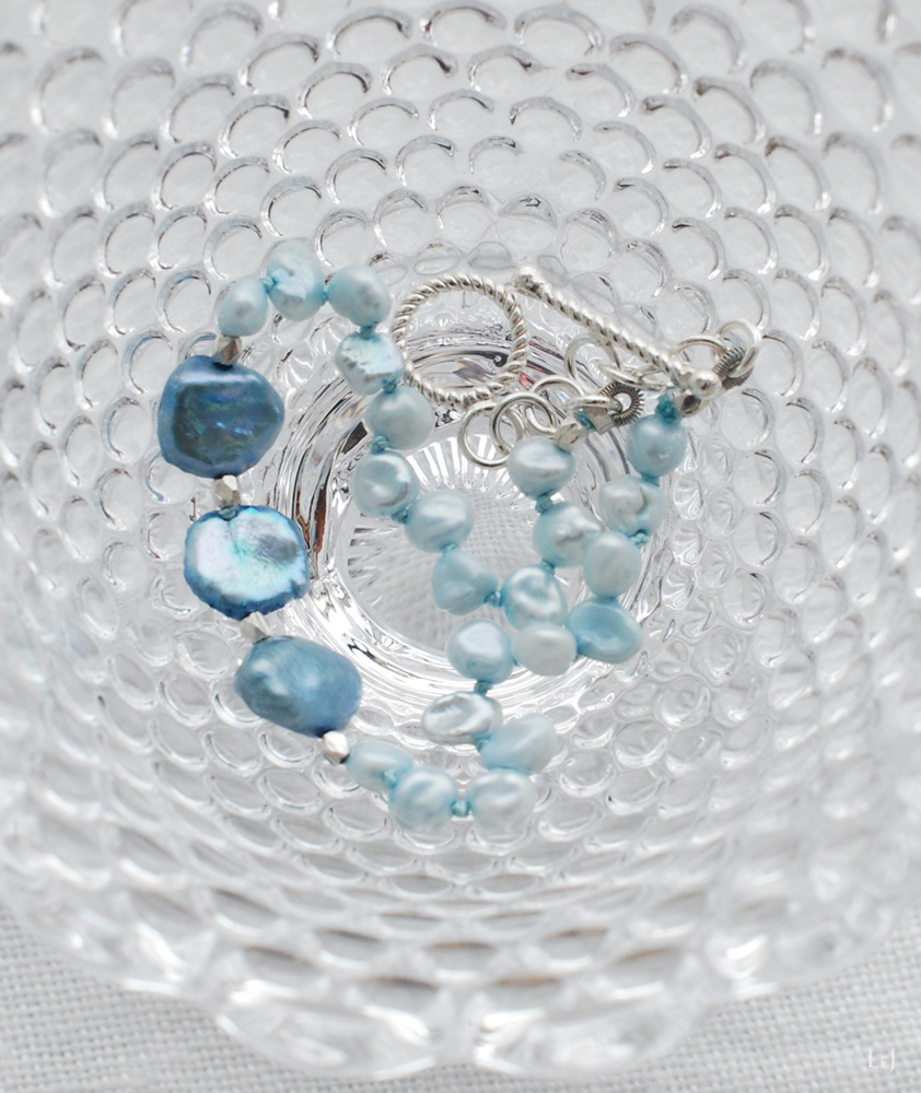 クレオパトラシェイプは、素材のやや端にホールを開けてあって、繋ぐと左右に素材が拡がります。よくこんなにちいさなパールにそんな加工をしたものだとため息が出るくらいにスイート。一粒の大きさはちょうど米粒くらい、それを丁寧に糸で紡ぎました。ややメタリックがかったブルーのパールと組み合わせ、シルバー925とのマリアージュに。