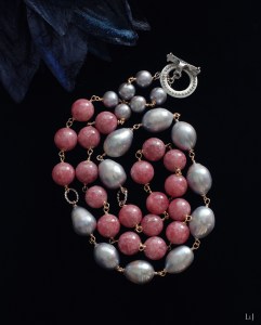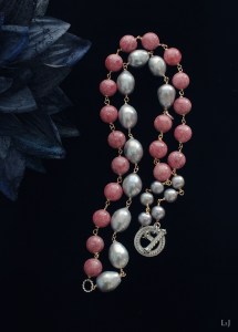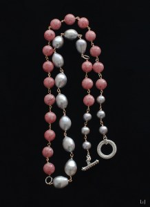 甘いピンクと白のマチエールをもつロードクロサイトと大粒のパールのネックレス DE BOIS(デゥボワ)。