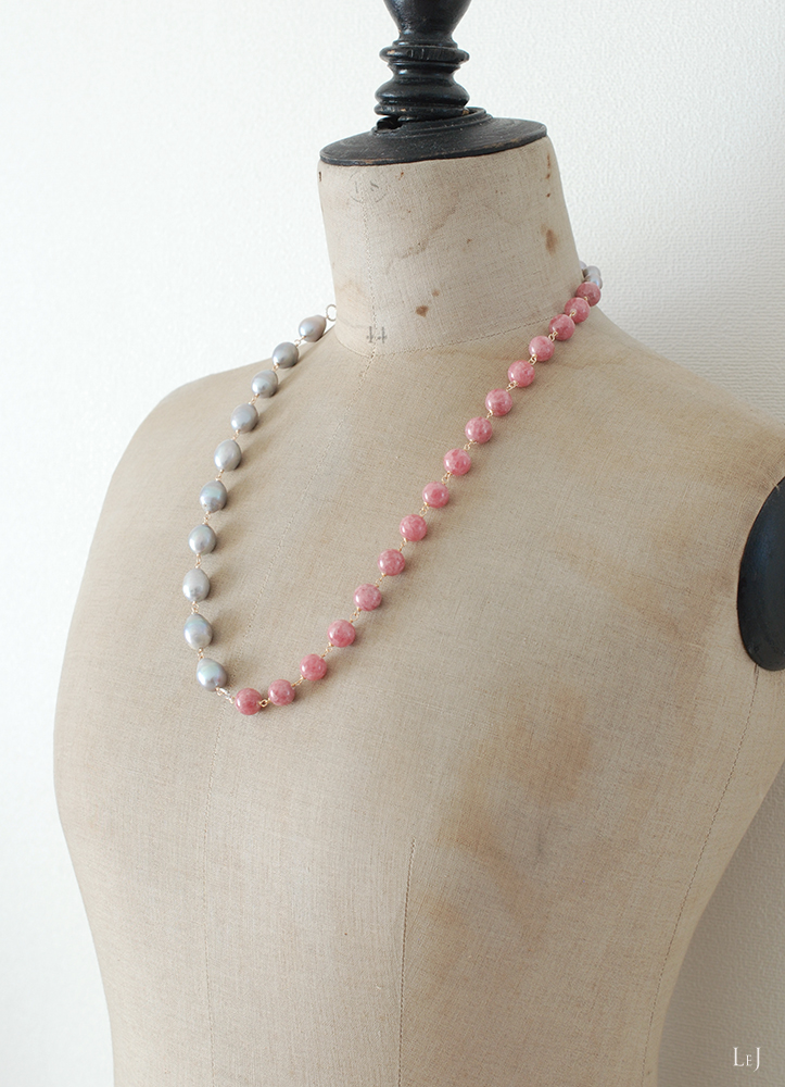 甘いピンクと白のマチエールをもつロードクロサイトと大粒のパールのネックレス DE BOIS(デゥボワ)。
