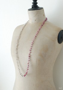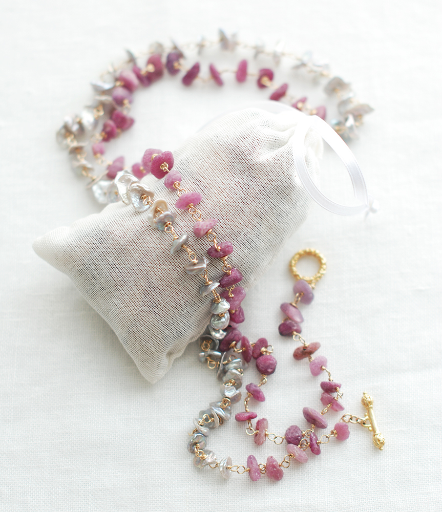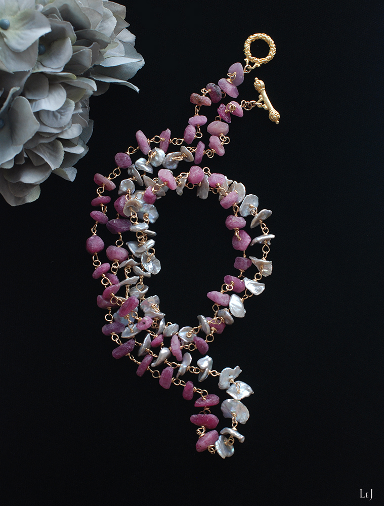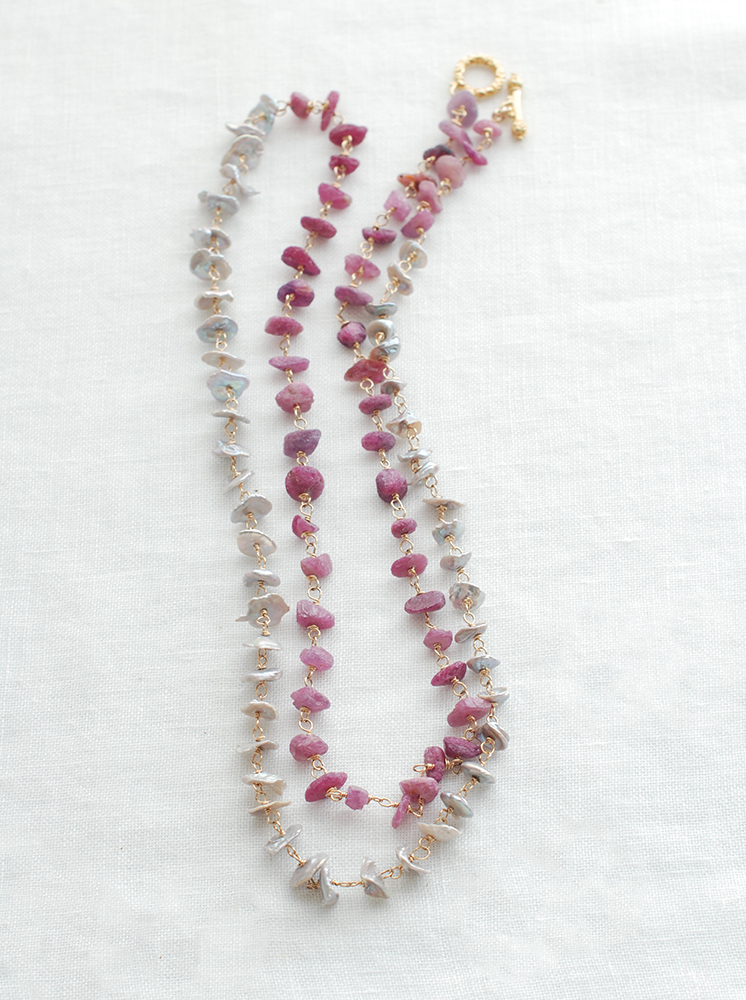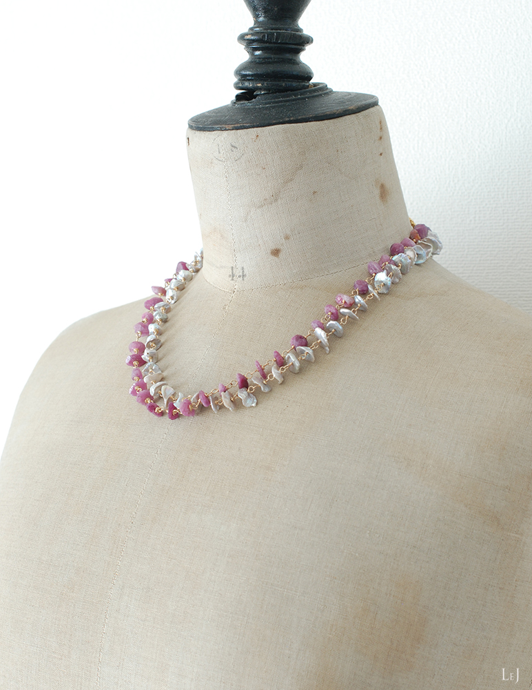 マットなルビーとケシパールで長いラインを紡いだネックレス Roseline(ロズリーヌ)。
