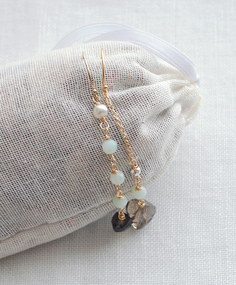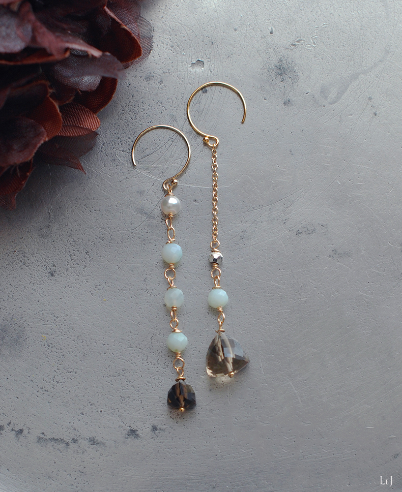 ベビーブルーのちいさな粒が愛おしいペルー産ブルーオパール、ポイントになっているアコヤパールとシルバーパイライト、そして印象的なカットのスモーキークオーツを使ったアシンメトリーのピアス Lia69。