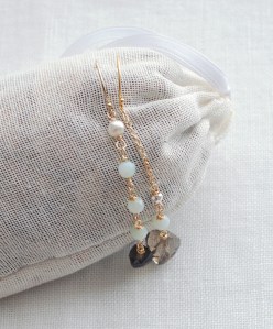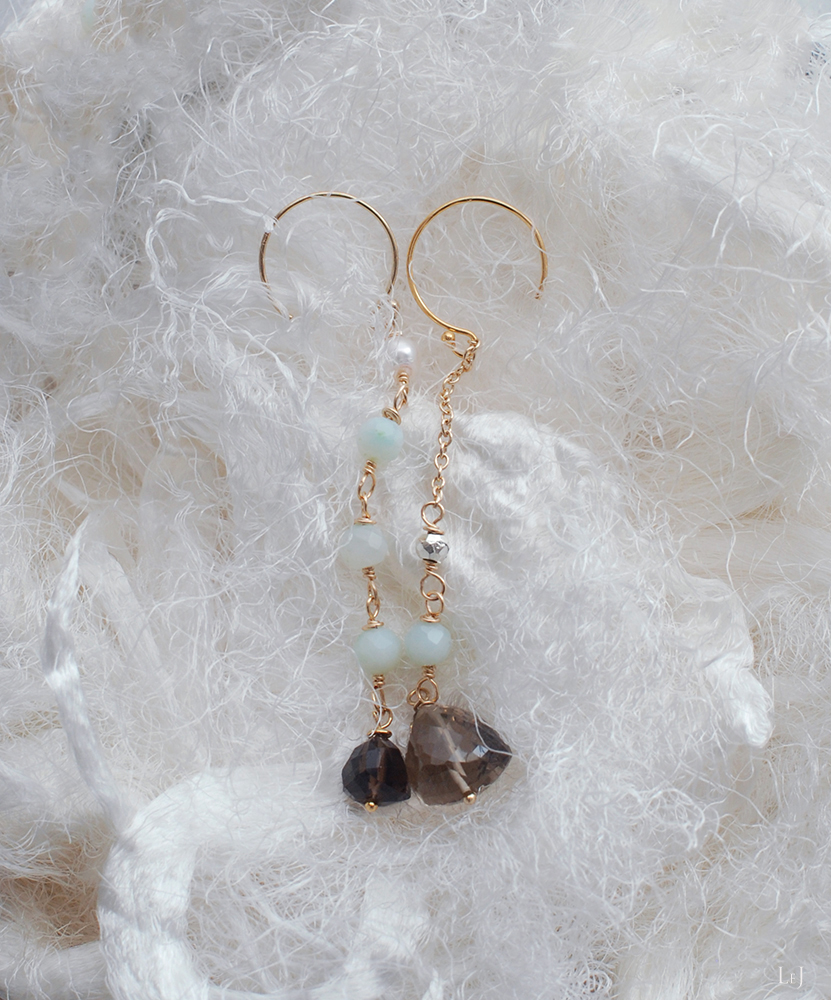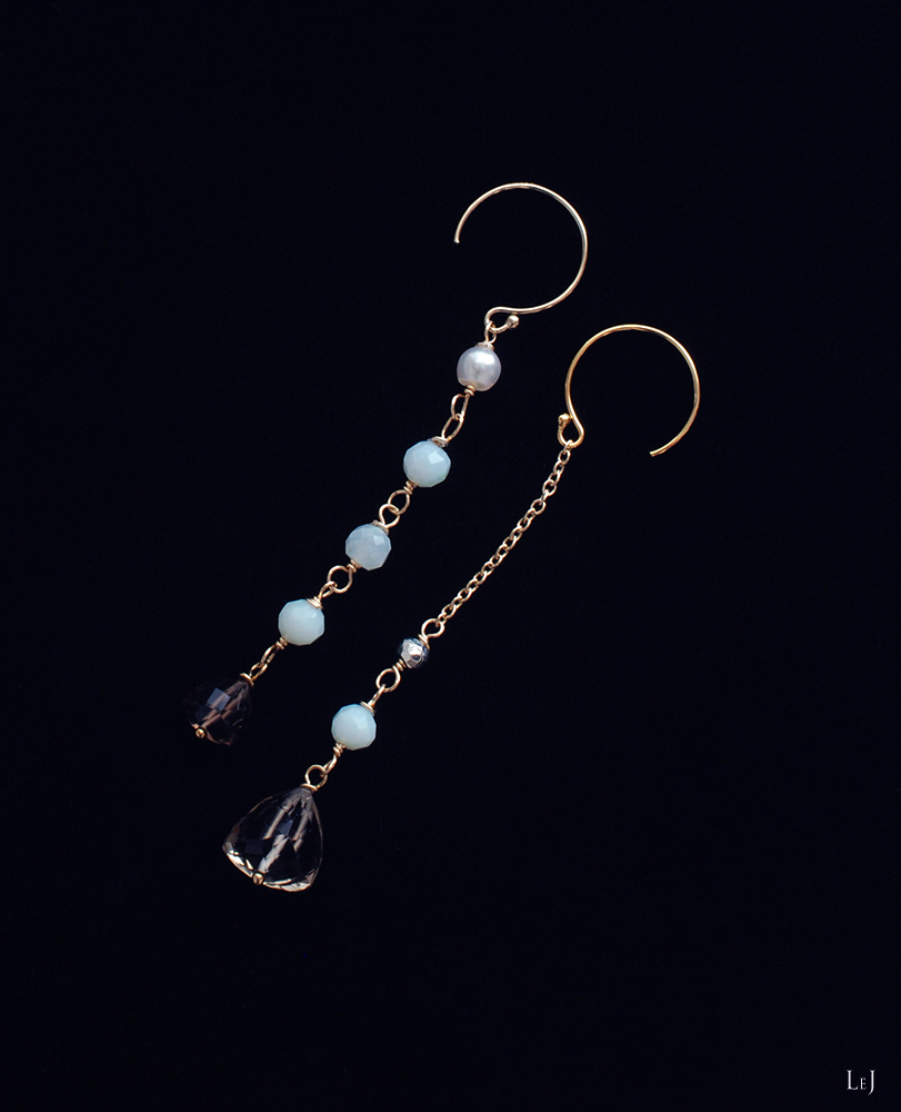 ペルーのブルーオパールはLeJではもっともよく使う私も大好きな天然石素材、そして二粒のスモーキークオーツは50年以上前の希少なストックを入手したものです。今ではなかなか目にすることもなくなった、まるで宝石質のような温かみと華やかさとを併せ持った丁寧なハンドカットはコーヒーゼリーを思わせる色調。ぜひお手に取ってご覧いただきたいスモーキークオーツです。