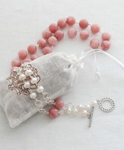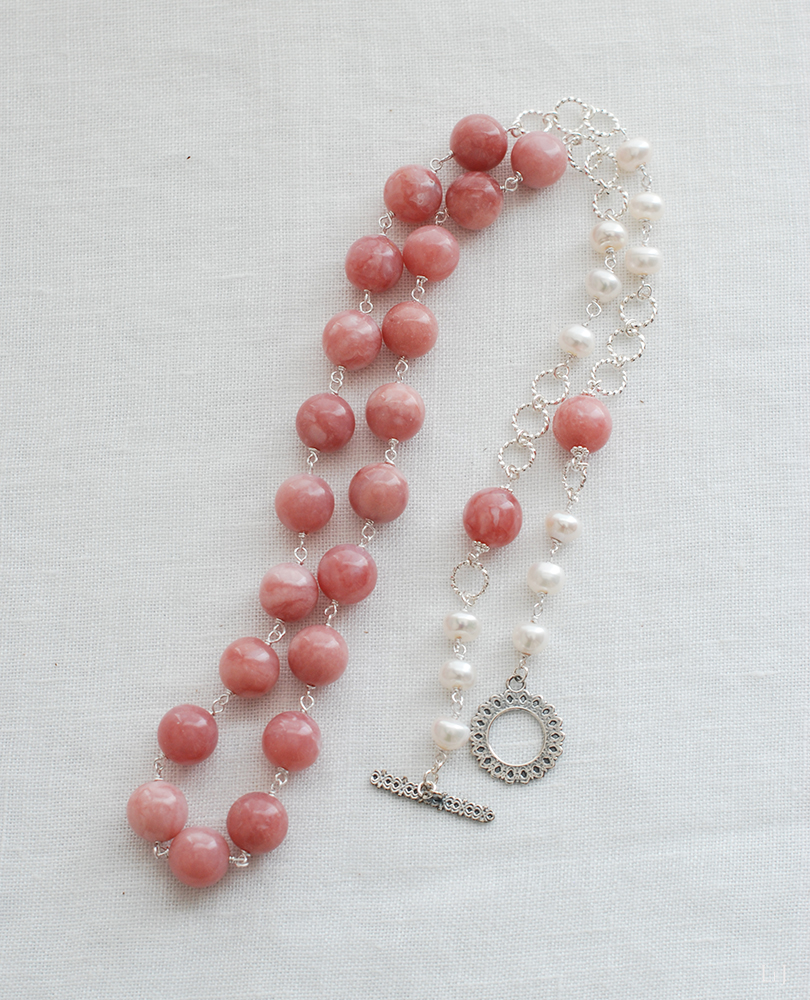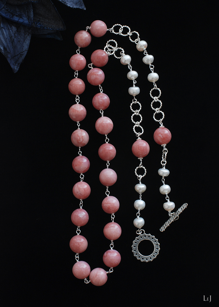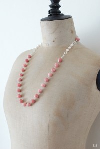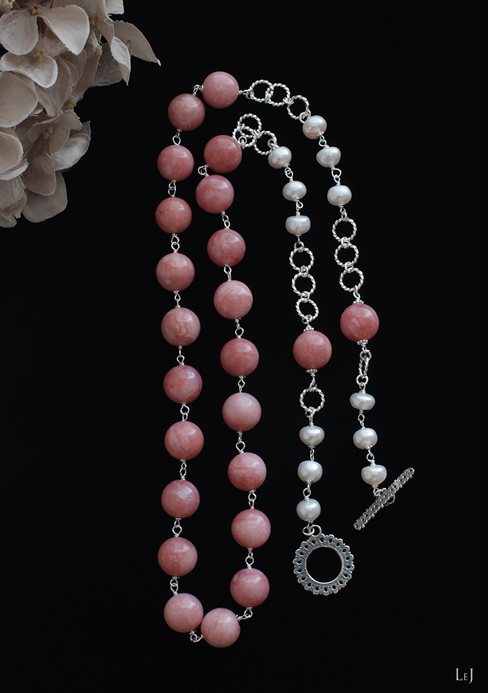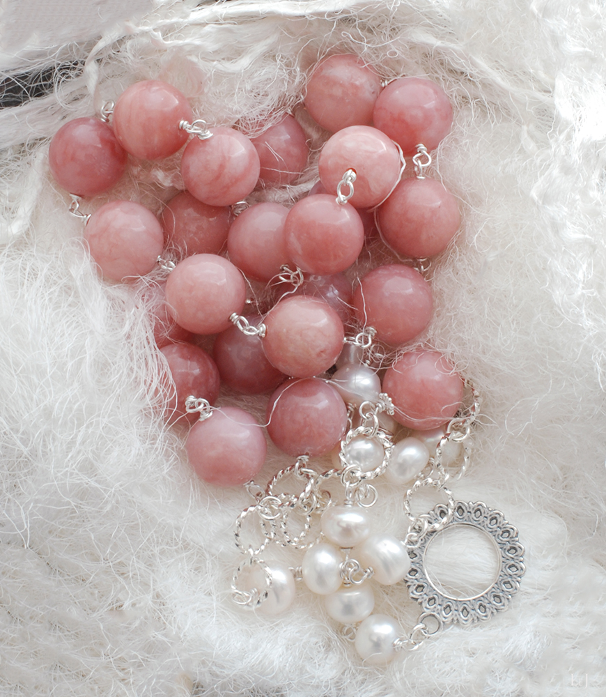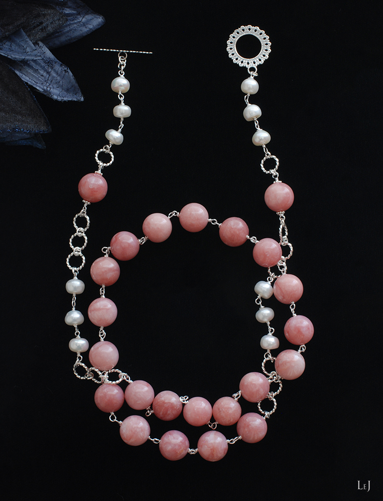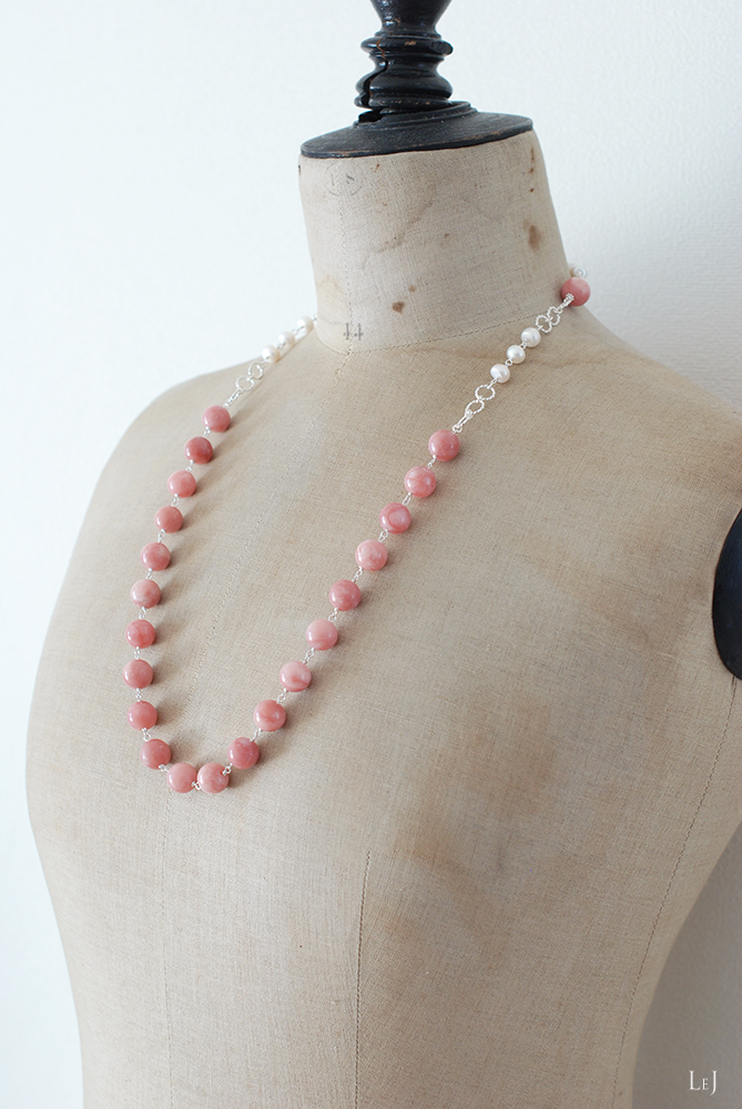 ⌀12mmのピンクオパールと控えめな白いパール、シルバー925のクラシカルモダンのリングが春の光を集めるネックレス。長さ72cm。大人のスイート。今回も吟味したマンテルを選んでいます。