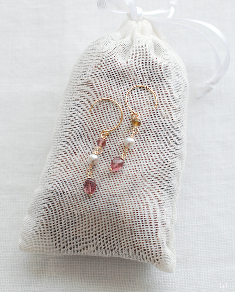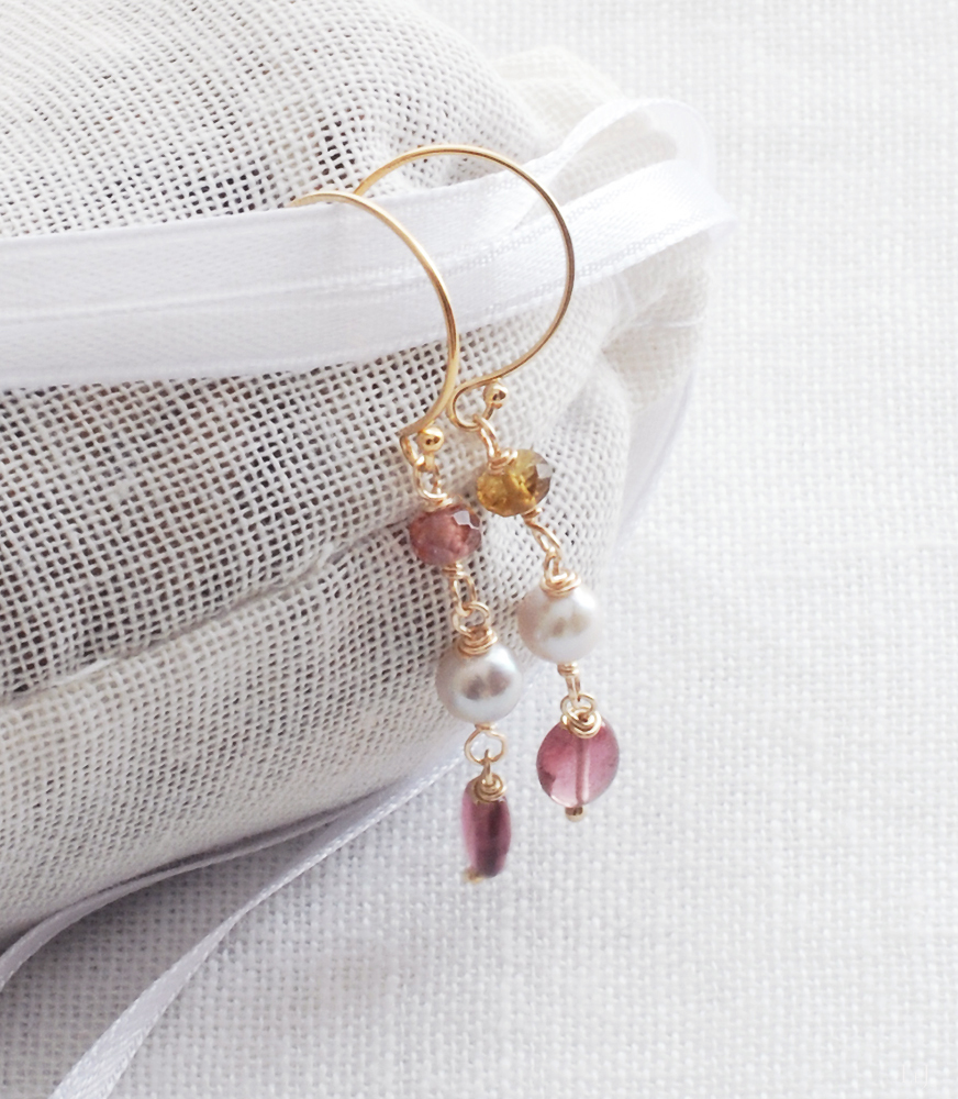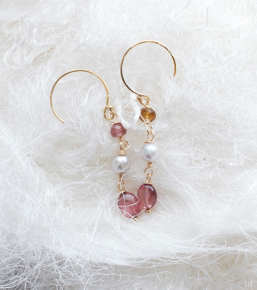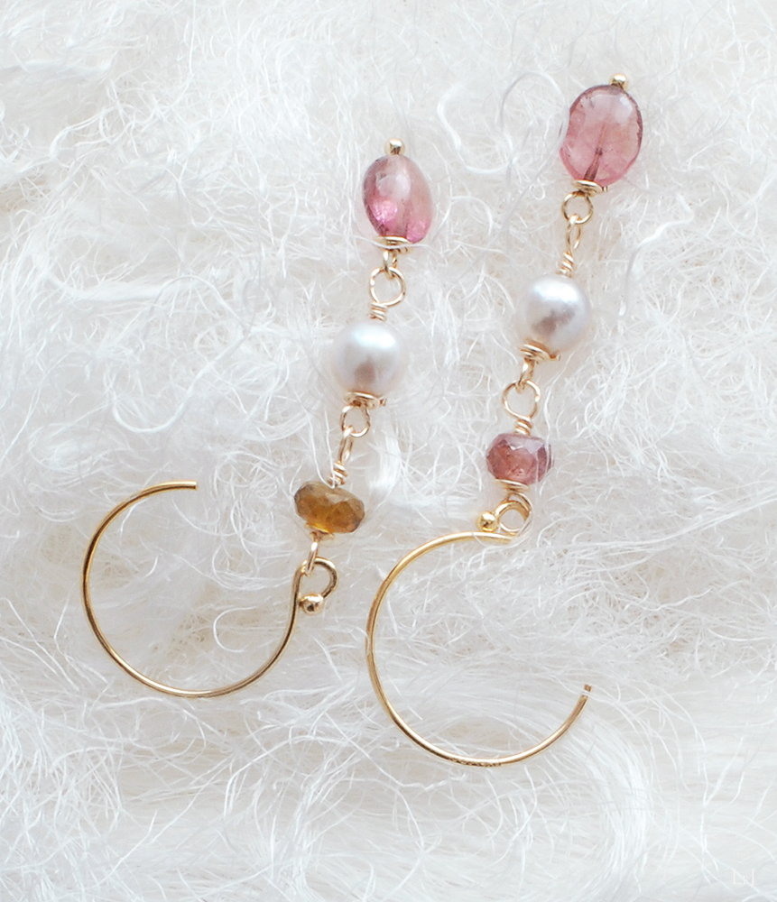 幼い頃、そうっと内緒で母のジュエリーボックスを開けてみたときの、なんとも言えない心躍る気持ち。ミドルトーンの天然石がちらちらと揺れて頬の横で小さな光を作るピアス。ピアスホールからの長さ46mm。