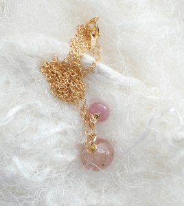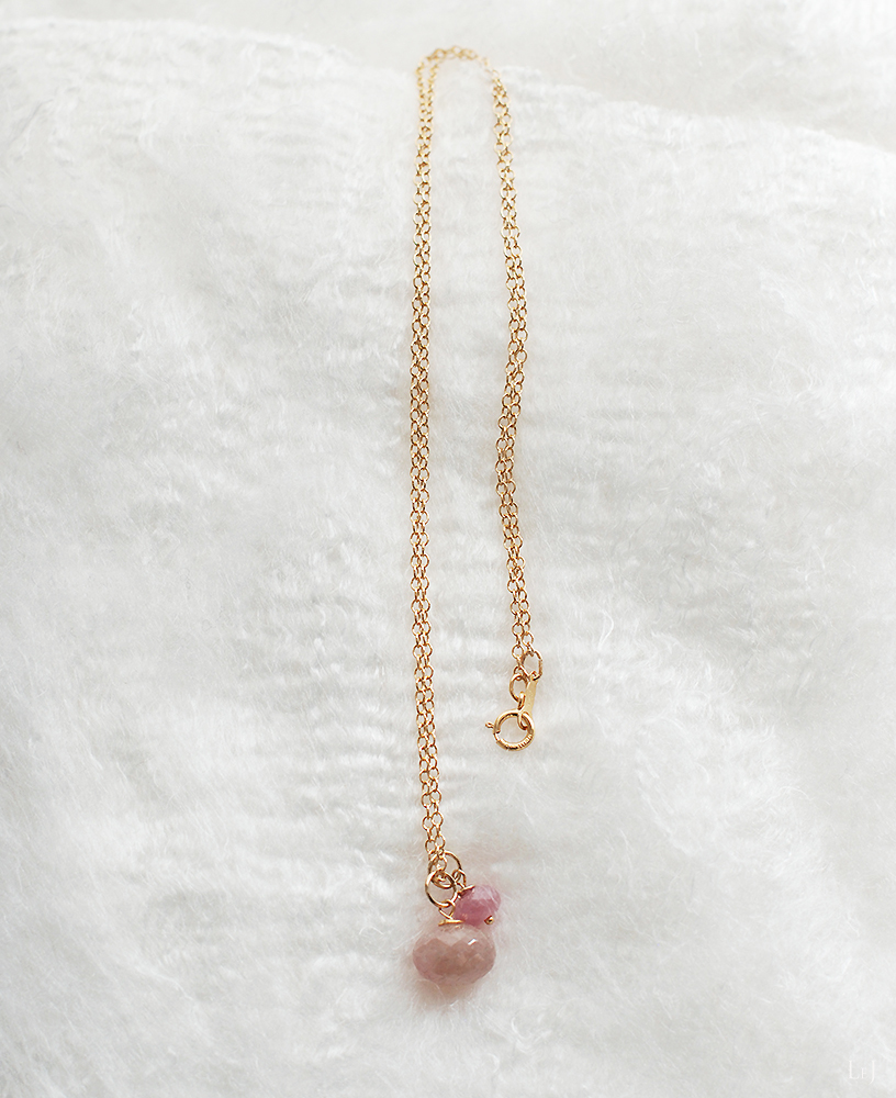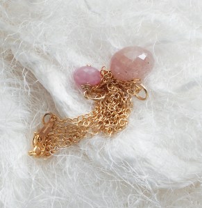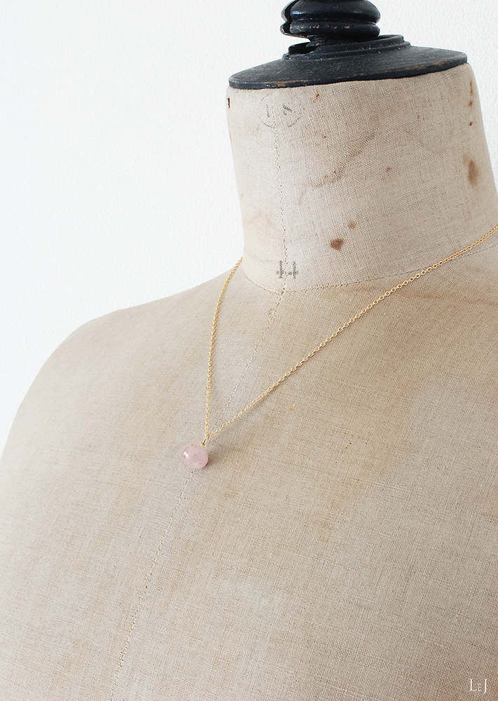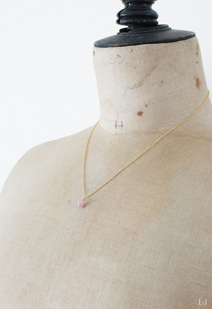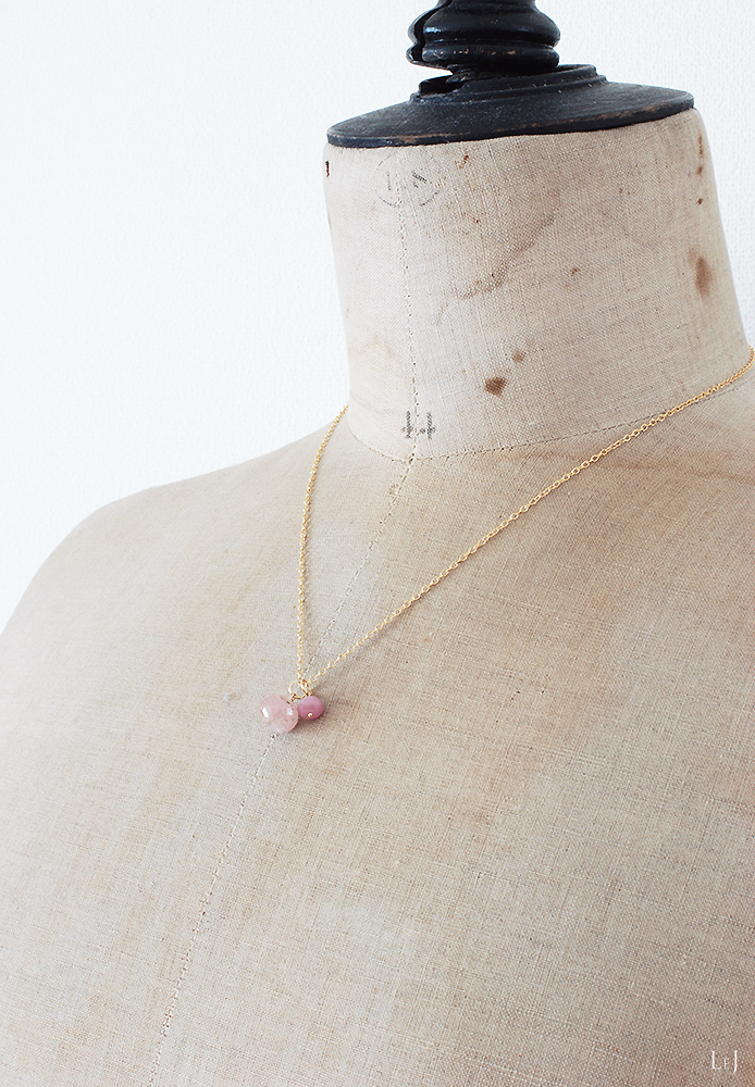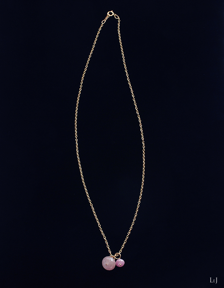 とくに大きい方の粒は肌に馴染みやすいヌーディな発色で、粒の大きさがいやみにならずに華やかに映えます。45cmのK14ゴールドフィルドのチェーンに通しました。