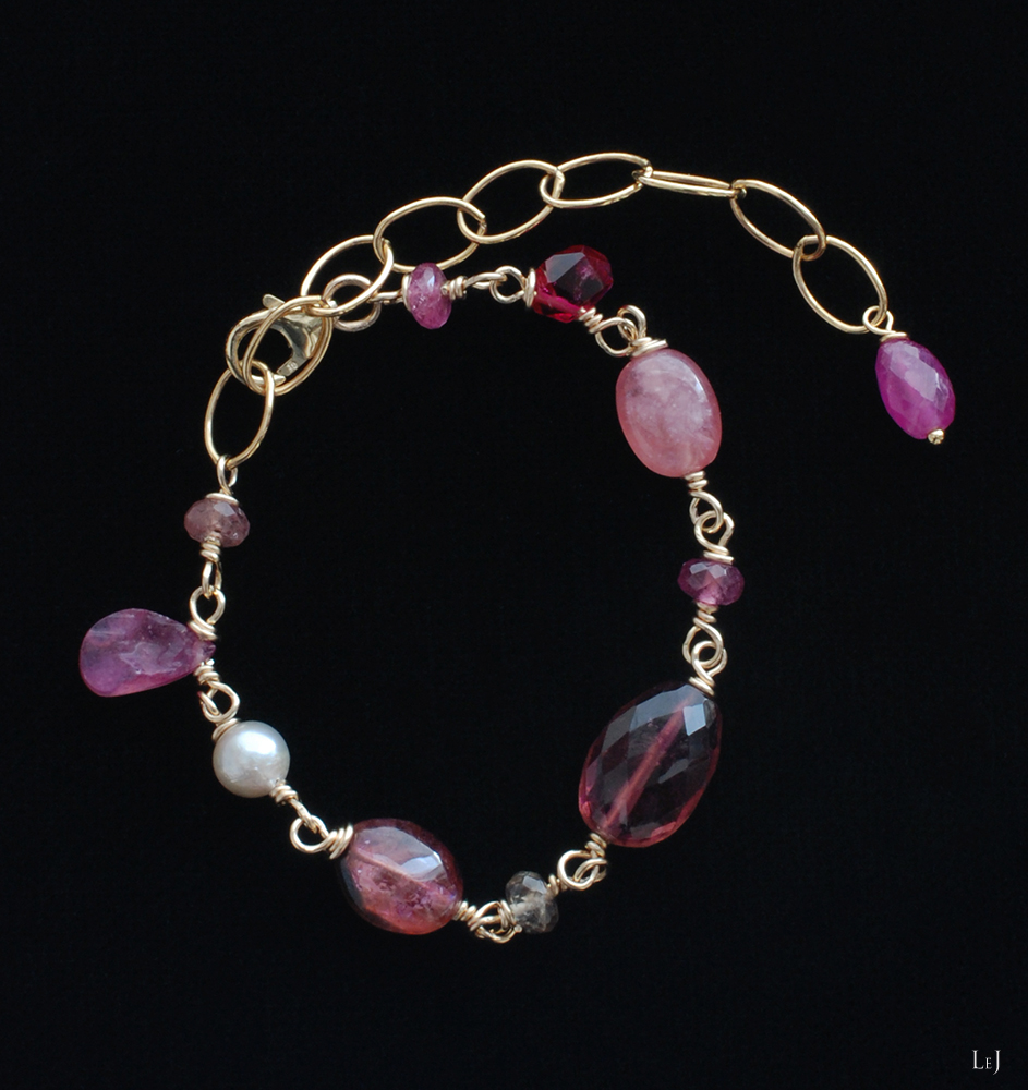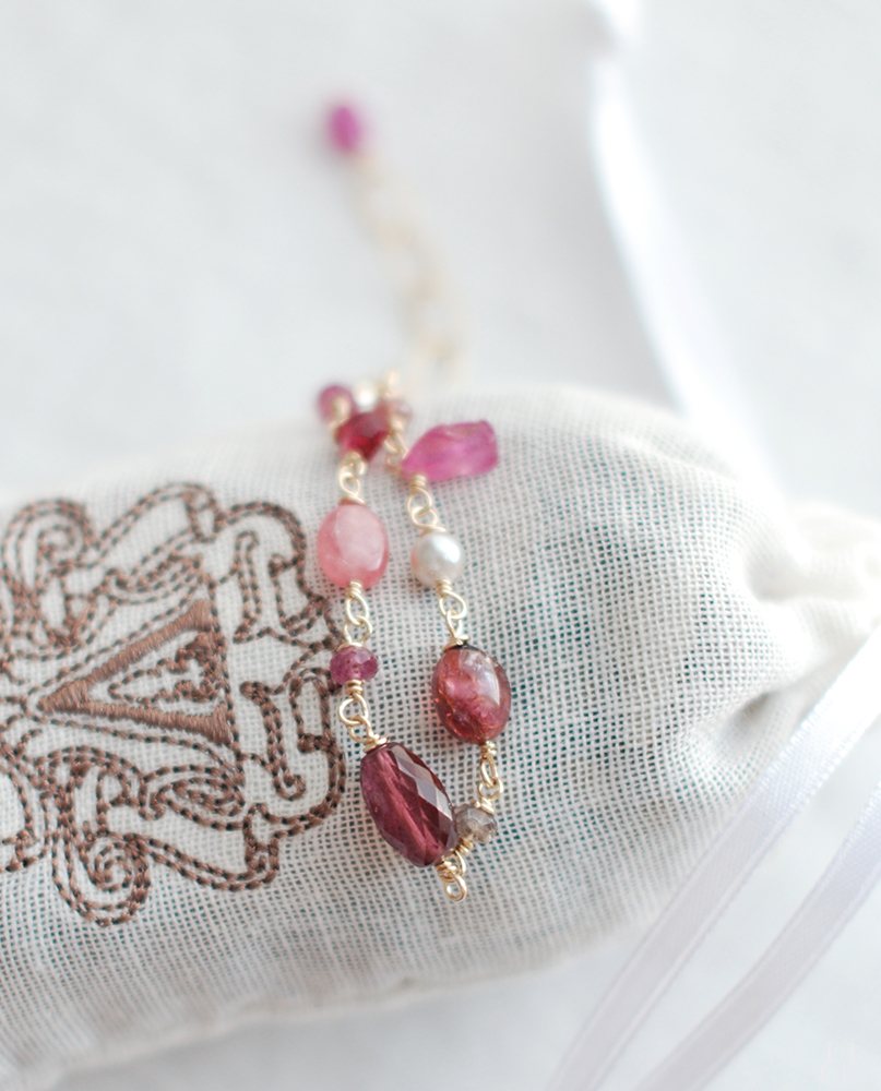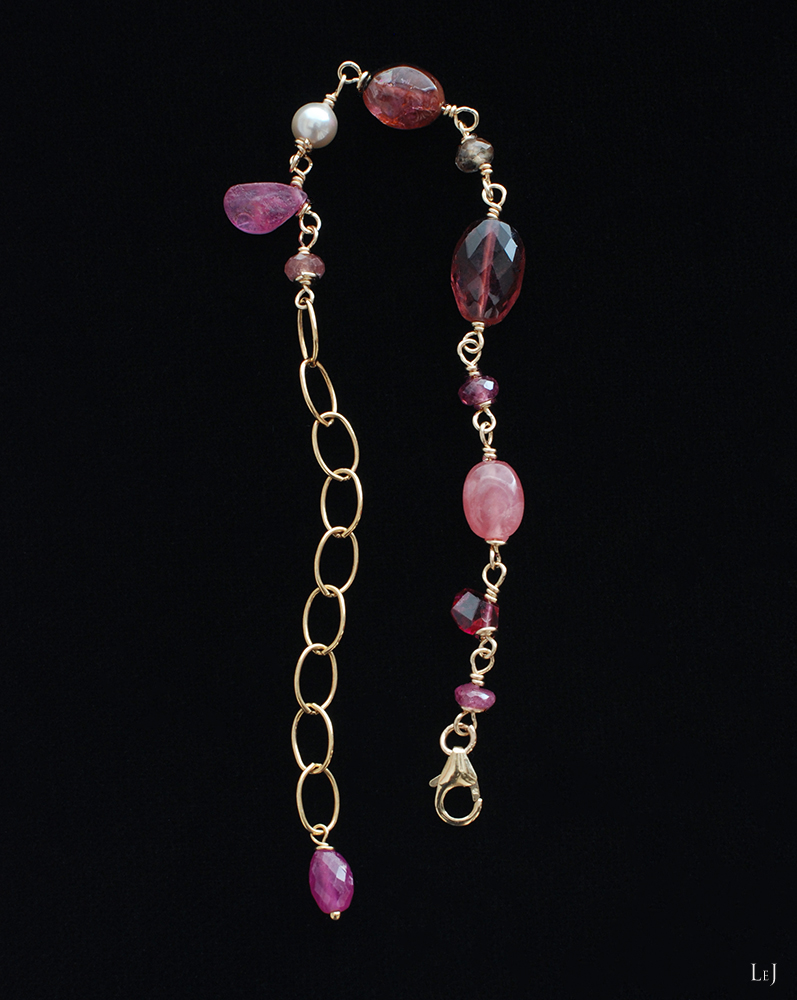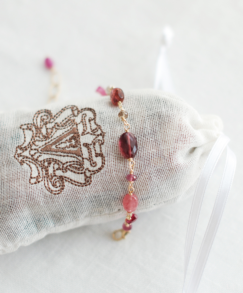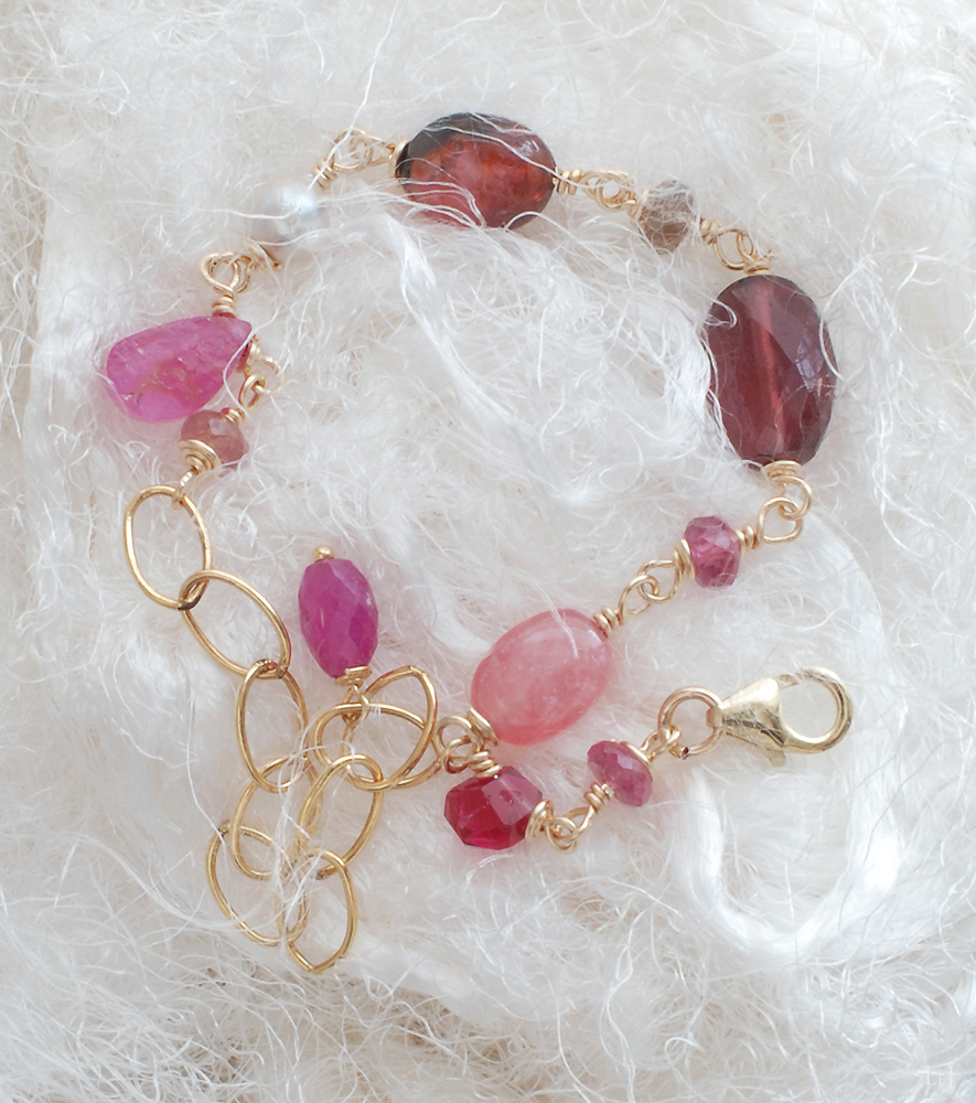 さまざまなトーンのレッドからピンク色の、貴石や半貴石の素材を集めたブレスレット Solange2(ソランジュ2)。
