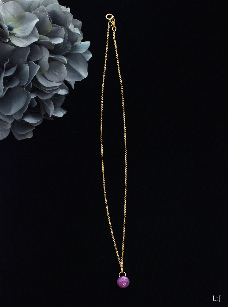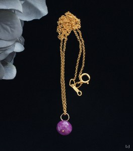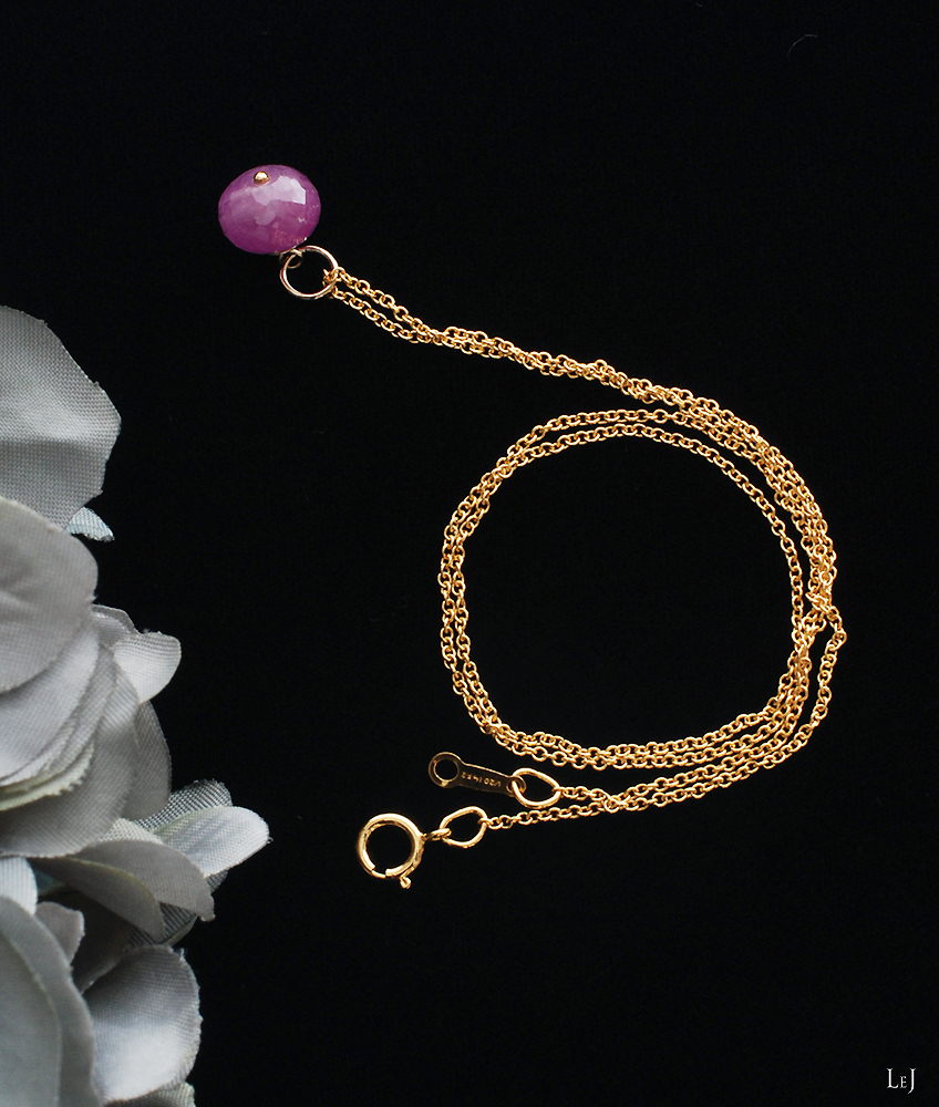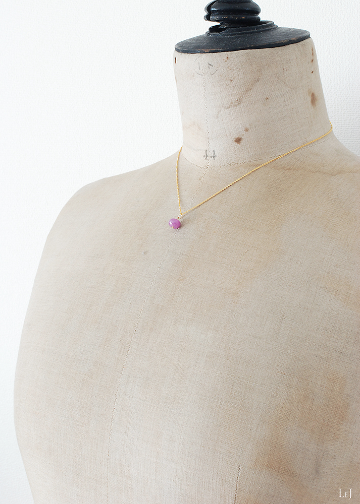 couture10のサファイアはくっきりとしたフーシャピンク、⌀8mm×7mmのころんとした形で厚みもあって印象的な粒。継ぎ目のないリングに通してトップにしました。40cmのK14ゴールドフィルドチェーンとよく合っていて、粒の美しさを活かしてシンプルに仕上げています。