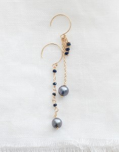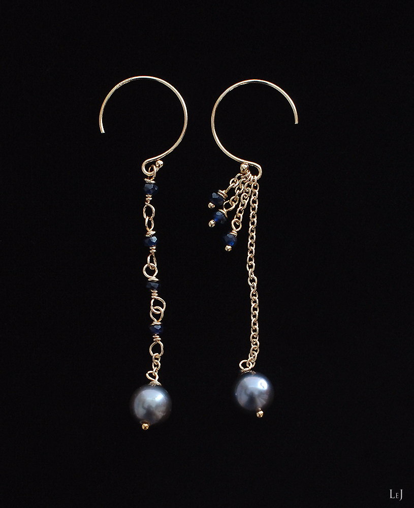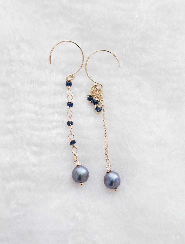 小さいけれどきれいなブルーサファイアが手に入ったので、アコヤパールと合わせてアシンメトリーのピアスを作りました。