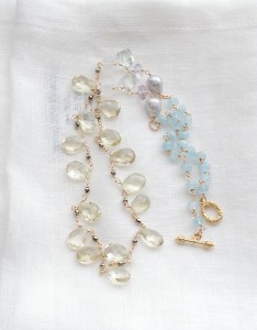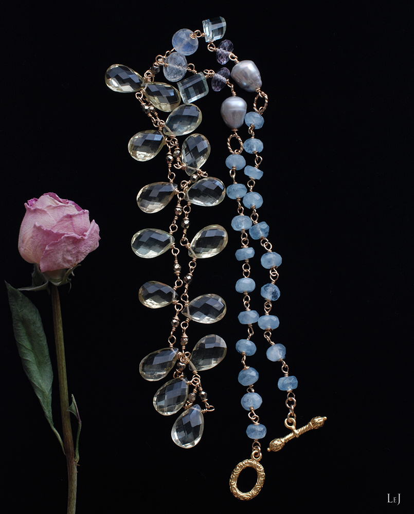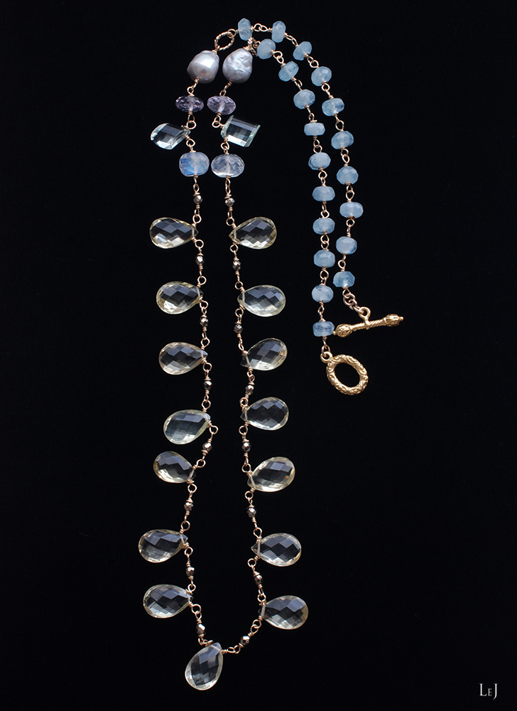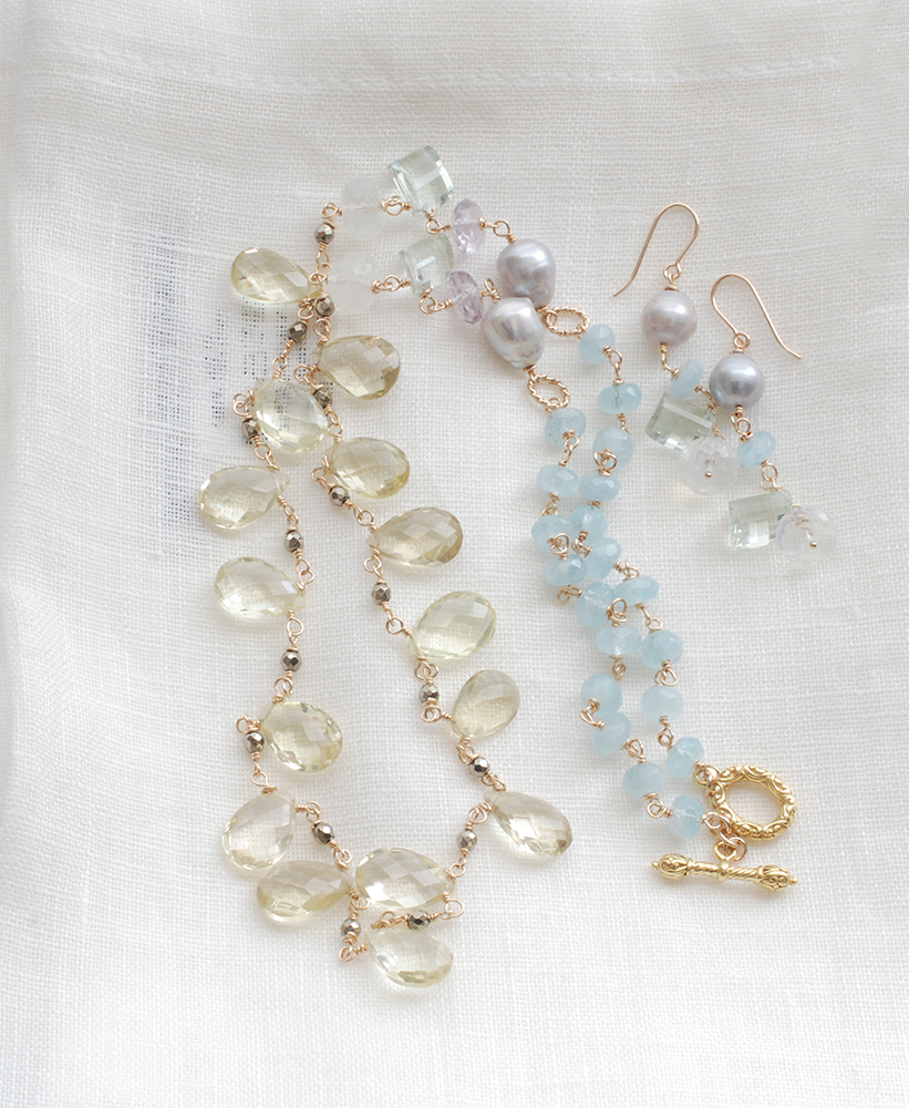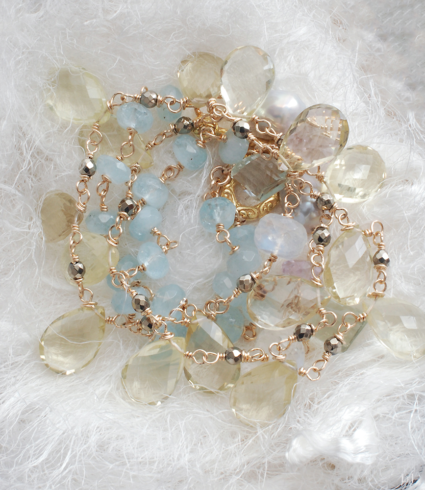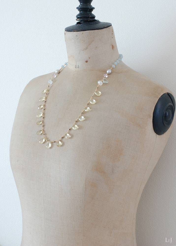 ファセッテドブリオレットカットのレモンクオーツをセンターに、シラーが美しいレインボームーンストーン、グリーンアメジストとピンクアメジスト、パールとアクアマリンなどの天然石を使っています。着けると鎖骨のあたりにパールやアメジストが映えて、それぞれの天然石の色彩とカットを楽しんでいただけるように。長さは66cm。