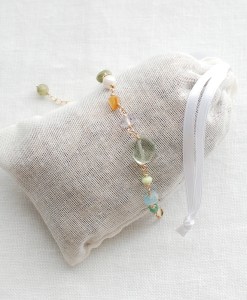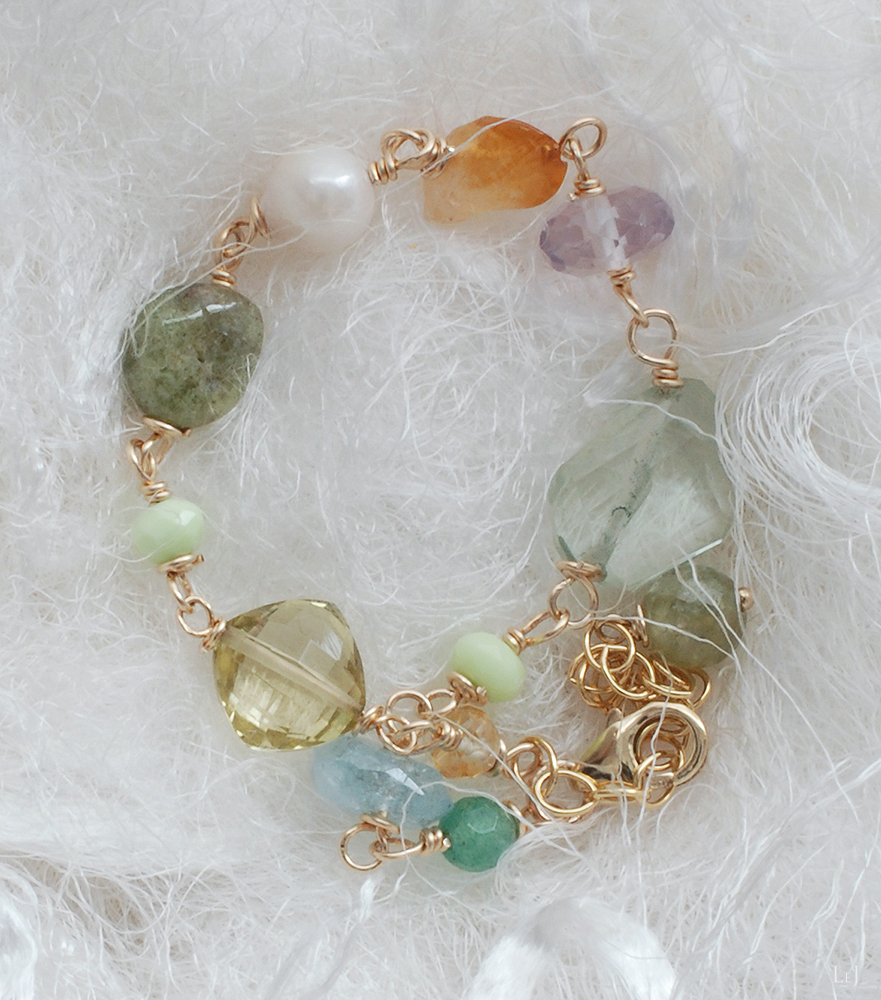 素材:留め具から時計回りに グリーンクオーツ・アクアマリン・レモンクリソプレーズ・グリーンアメジスト・ピンクアメジスト・シトリン・アコヤパール・グリーンガーネット・レモンクリソプレーズ・レモンクオーツ・シトリン・グリーンガーネット(アジャスターの先)・K14ゴールドフィルド