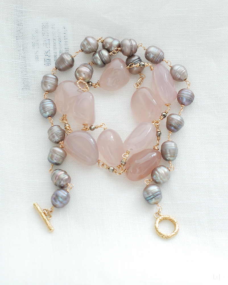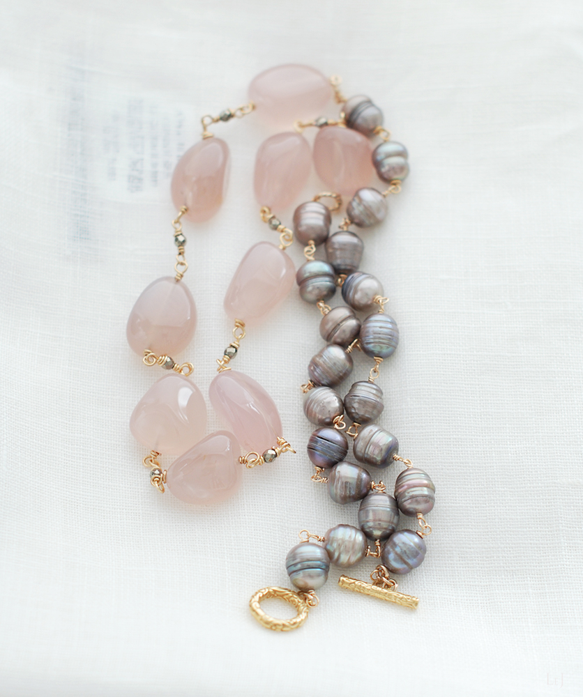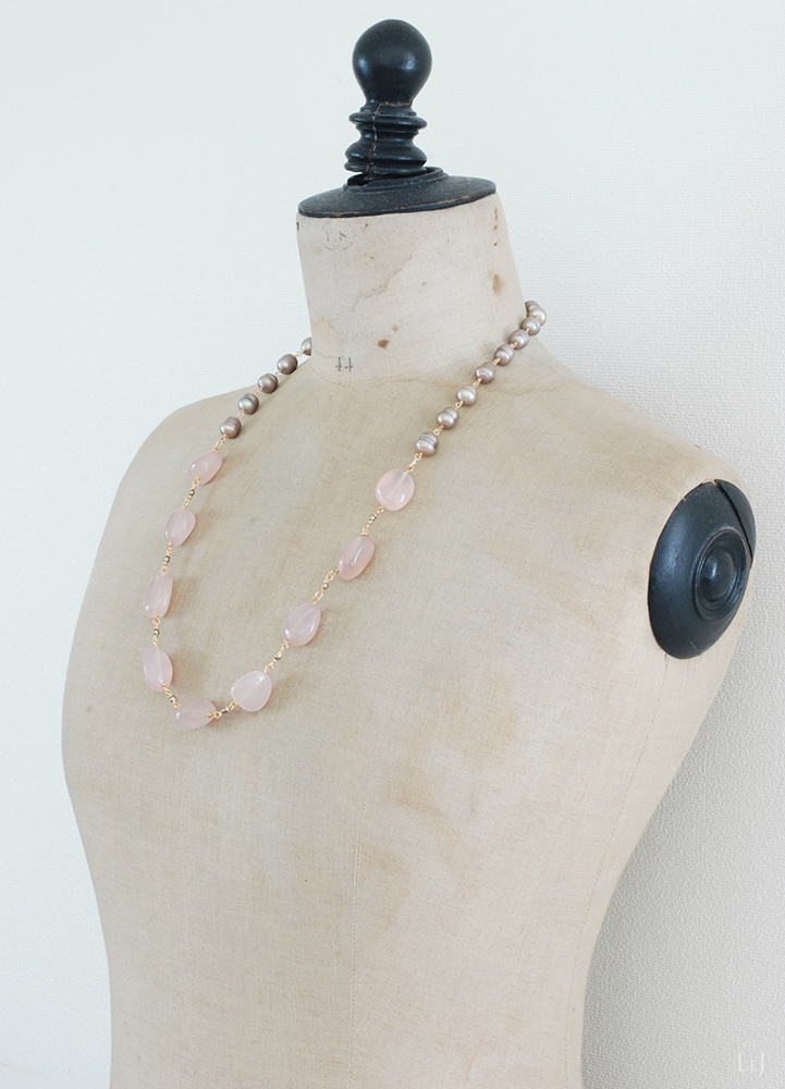 微睡むようなグレイッシュピンクのカルセドニーとクラシカルなグレイのパールで作ったネックレス Claudette(クローデット)。