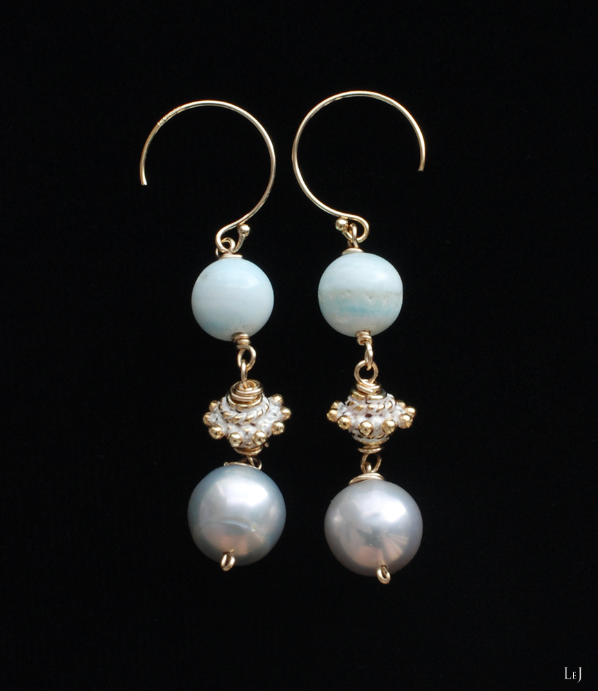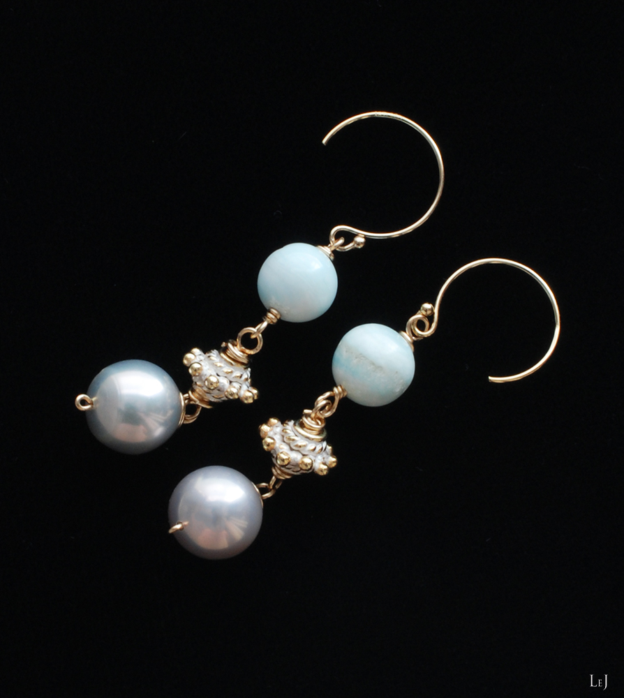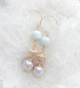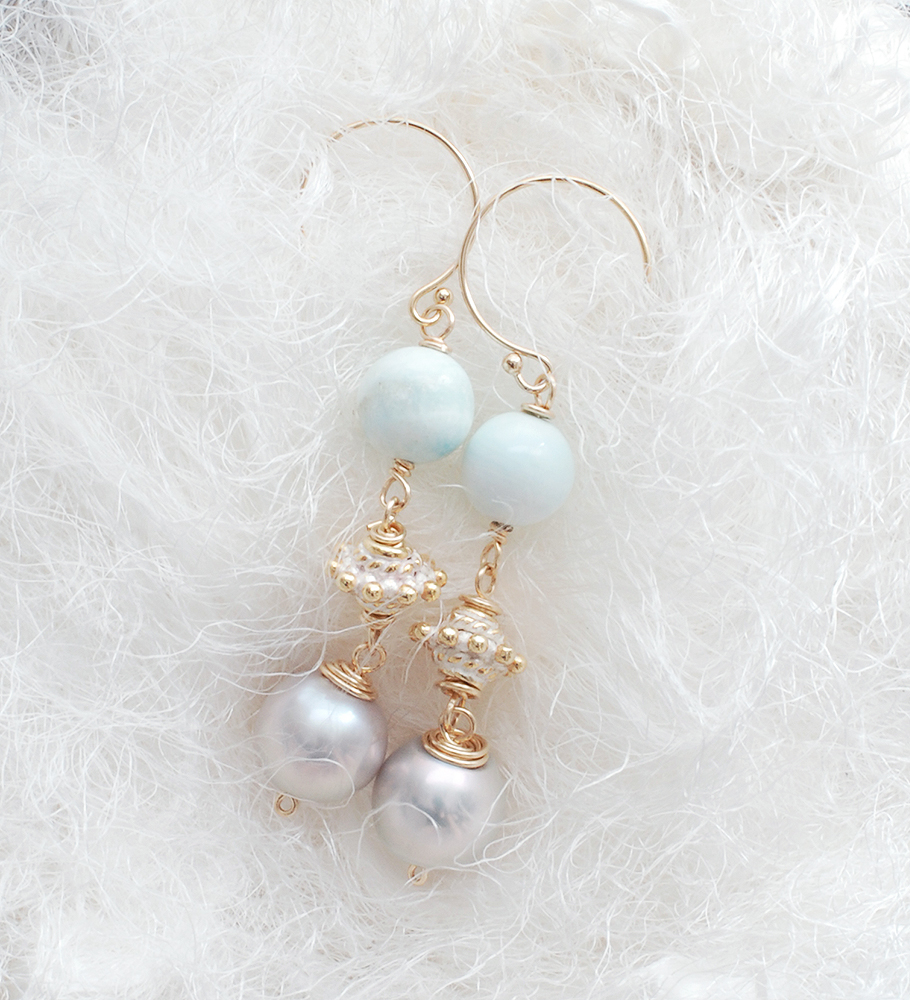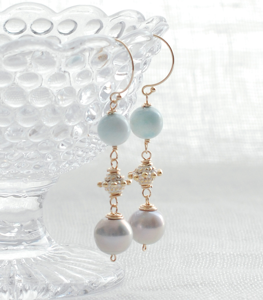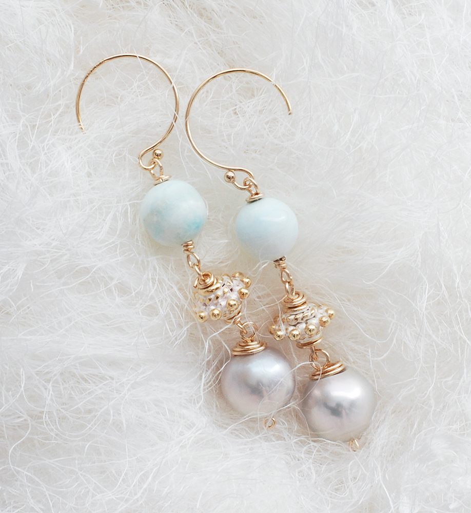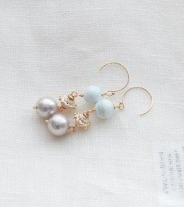 季節が変わって陽射しのいろが変わり、ピアスやブレスレットを着けるのが楽しくなります。独特なニュアンスを持つこのヘミモルファイトをあまいパーツと合わせ、パールを添えました。パールに巻くゴールドの色を多くしたくてワイヤーを使いました。