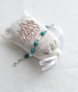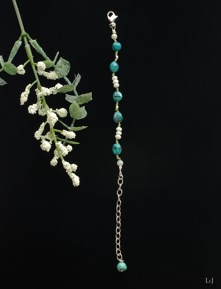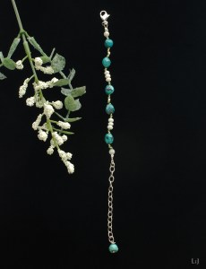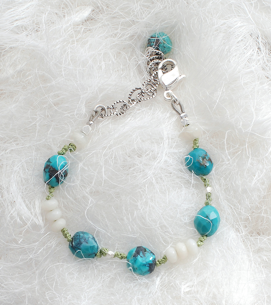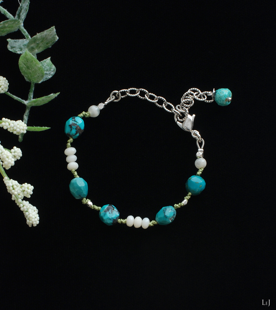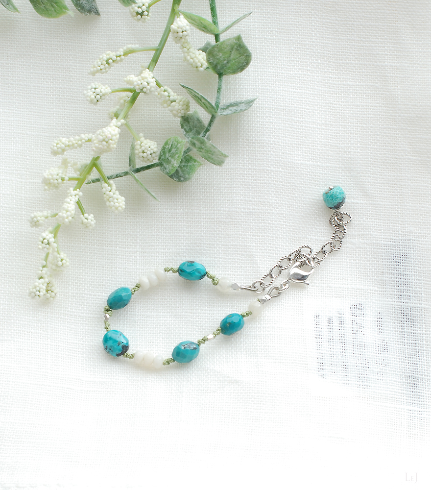 若葉いろのシルク糸にターコイズとホワイトコーラル、ちいさなシルバー925ビーズパーツを紡いだブレスレット Amalfi26-b。