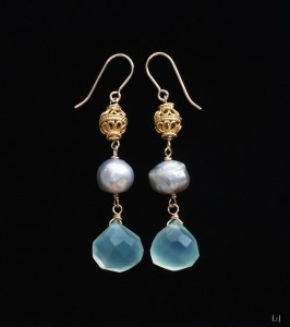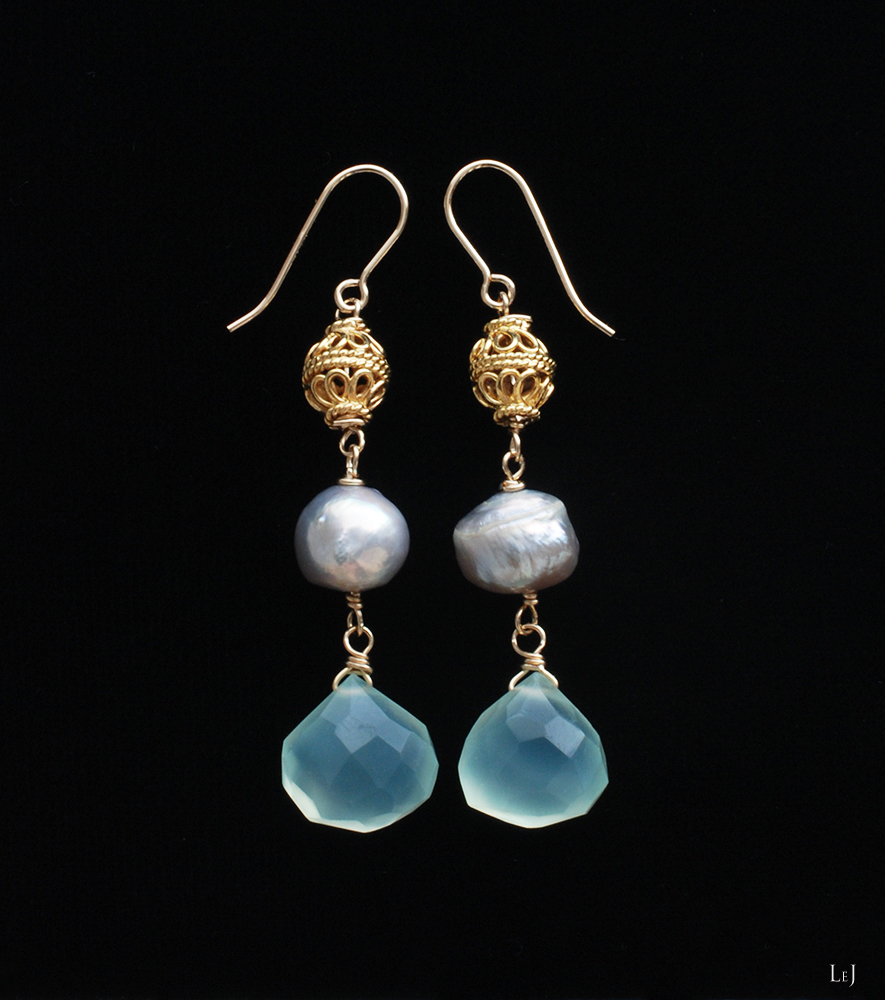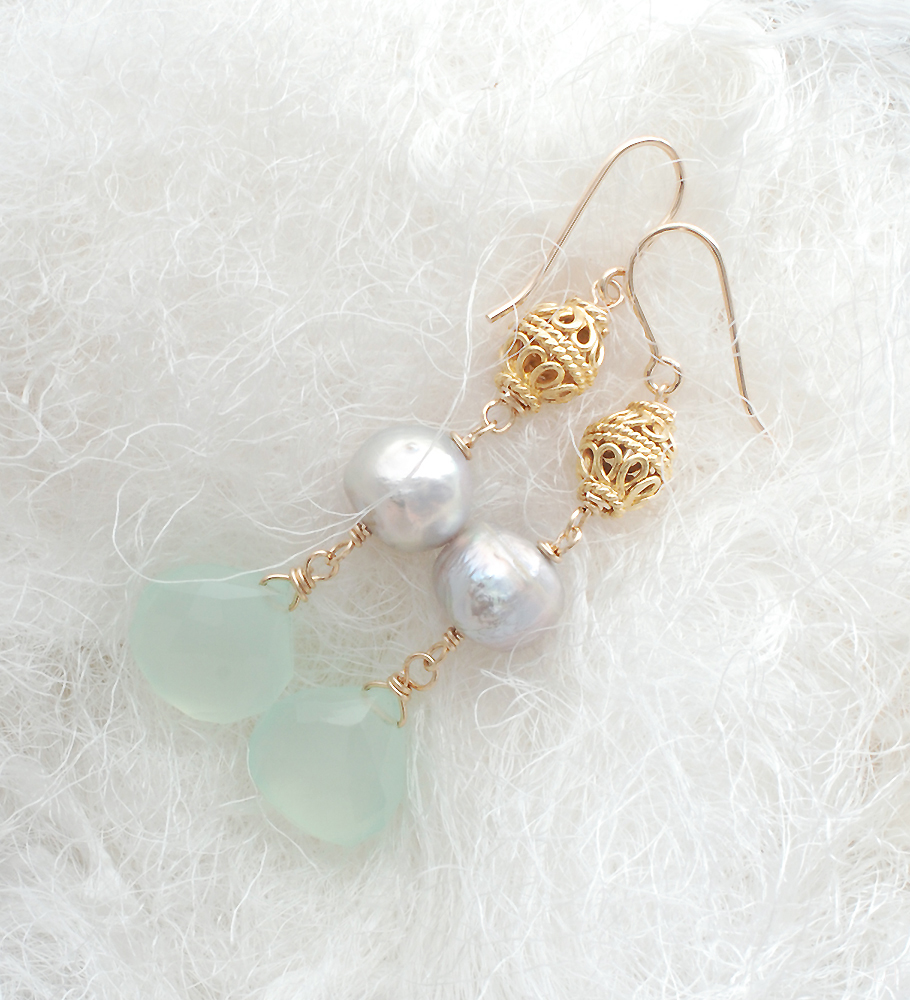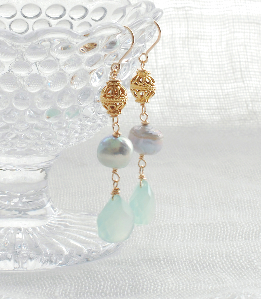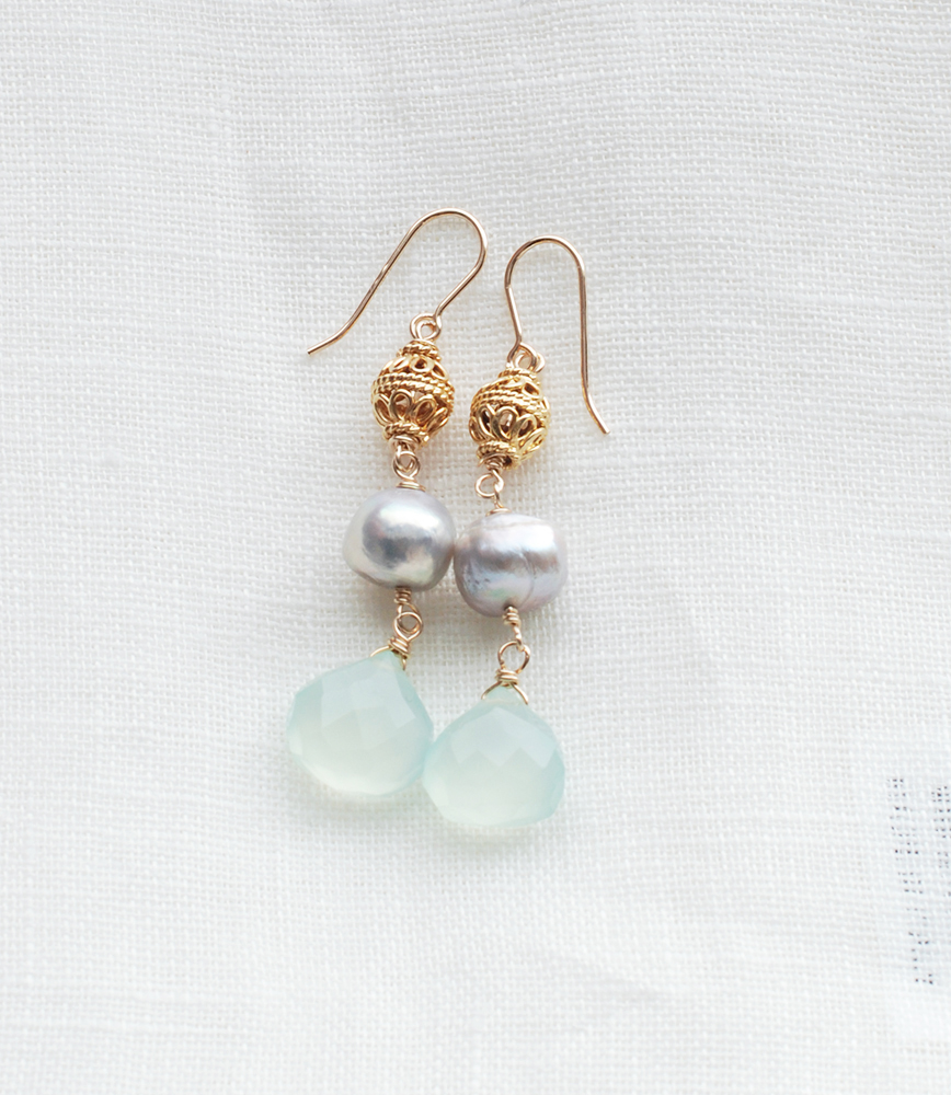 アンティークジュエリーのような空気感を持ちながら、カルセドニーのハンドカットの優しさがパールと溶け合うピアス。このグリーンカルセドニーはとても好きで数を揃えて購入して、レッスンでのワイヤーワークの素材としてもよく使いました。ニットからドレス、これからのコーデを引き立てます。