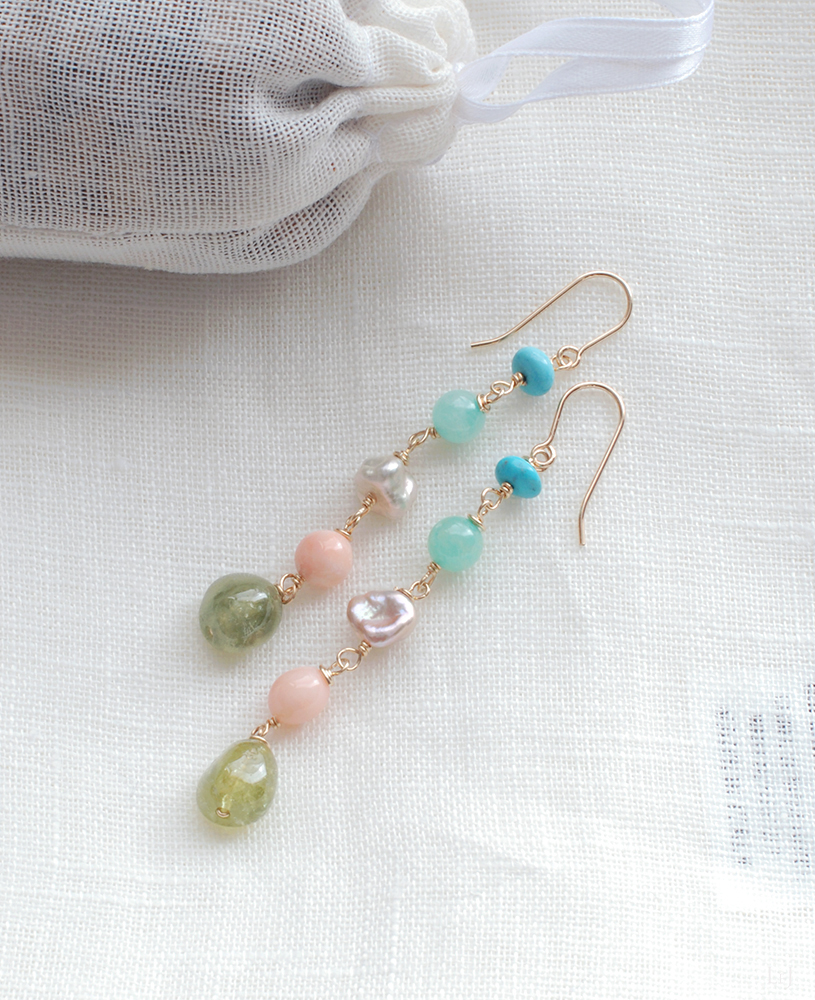 5種類の天然石は、いつも大切に使っている素材。こんなに綺麗な色を纏っているとシンプルなシャツにぐっと個性が生まれます。御髪の白いかたにもぜひ着けていただきたい、クリアな色を選びました。ナチュラルなメイク、シンプルなトップスに。リネンやコットン、ニットにも。幸福感あふれる、美しい縦のラインを描きます。
