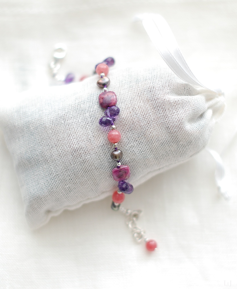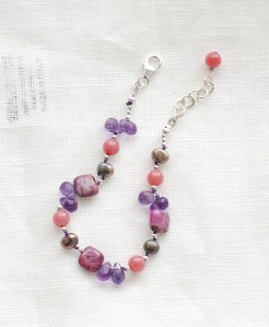 ちらちらと見え隠れする小さなシルバー色パーツ、グレイッシュトーンのなかで光を受けてきらきらするアメジストのブリオレットカット。シンプルなコーデに抑えたピンクとパープルが大人のスイートを添えて、白い肌にも日焼けした肌にも映えます。旅行先でもどうぞ。