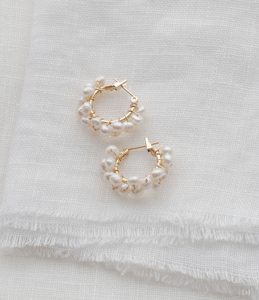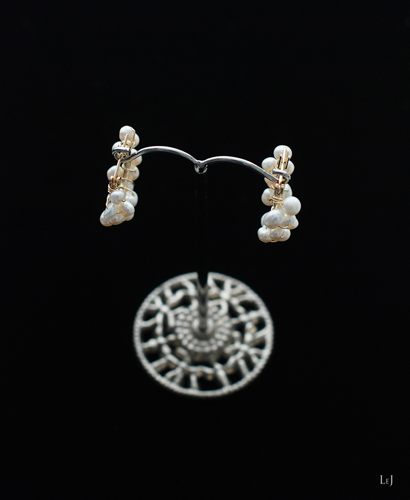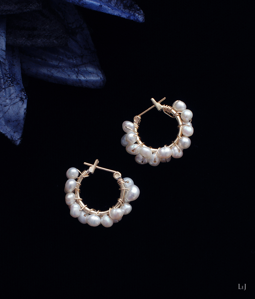 かちっとフープに巻き付けたのではなくて、ふわっとした仕上がりが優しい気持ちにさせてくれます。シンプルで華やかで心躍るジュエリー。パーツの美しさもご覧いただければと思います。
