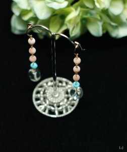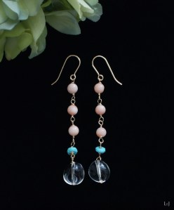 ナチュラルなピンクコーラルにスリーピングビューティターコイズとクリアクオーツを添えたピアス。