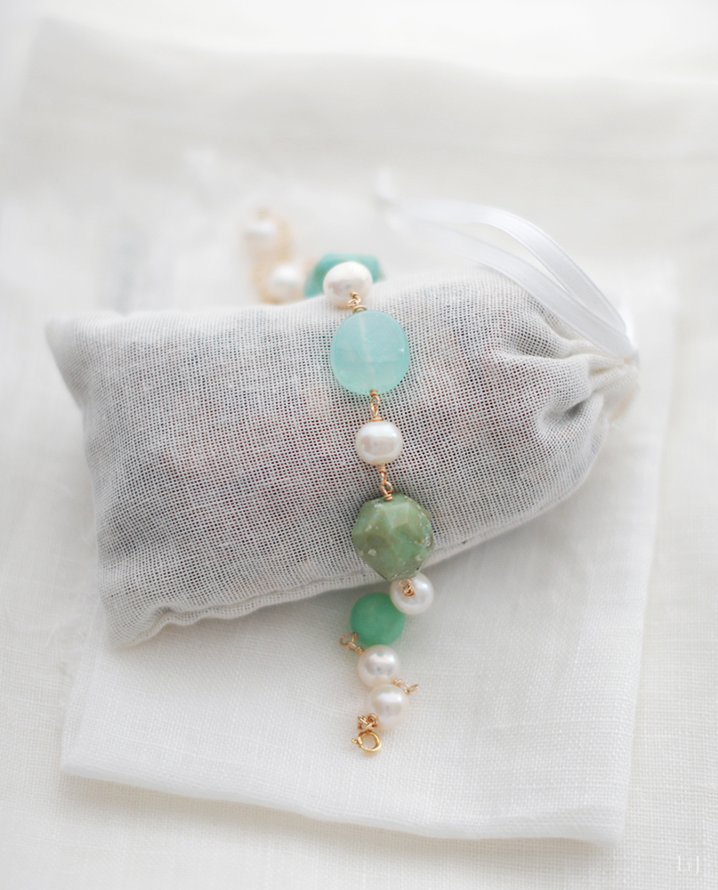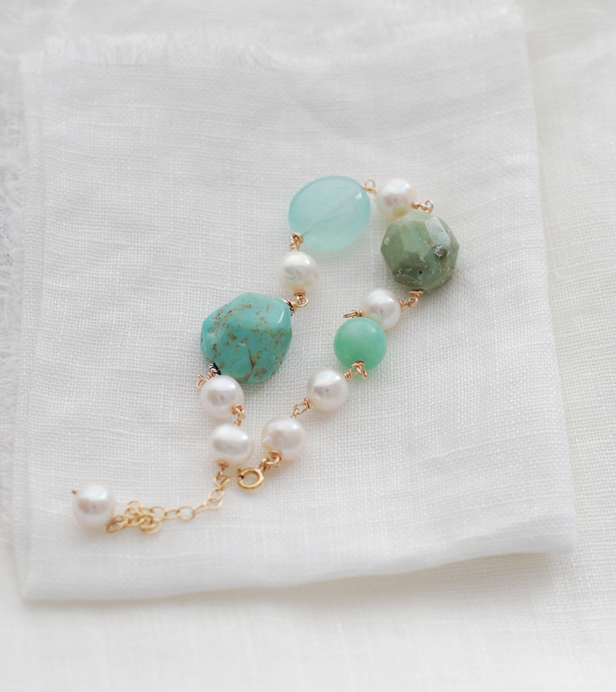とてもレアな素材を集めて、肌馴染みがよくてかつ華やかな仕上がりになりました。シルバー925やゴールド色のブレスレットとの重ね付けも楽しいジュエリーです。ウエアの一色とリンクさせたりコットンやリネンのシンプルなトップスに合わせてどうぞ。