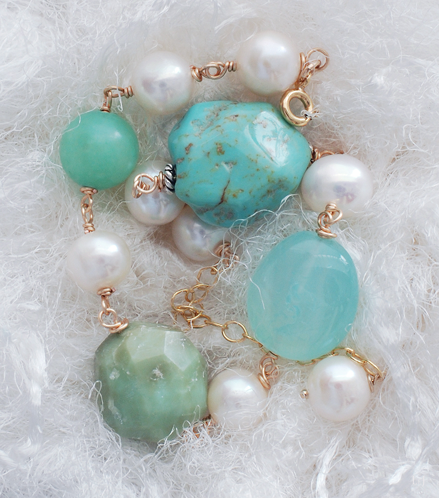 素材:留め具から時計回りに、淡水パール・ヘミモルファイト・淡水パール・クリソプレーズ⌀15mm・淡水パール・グリーンカルセドニー・淡水パール・エメラルドバレイターコイズ・淡水パール・K14ゴールドフィルド