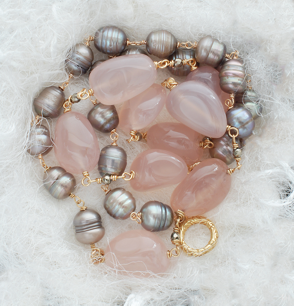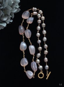 カルセドニーはLeJ(ルジィ)ではひそかに評判をいただいている素材、このピンクカルセドニーもとてもまろやかな大人のピンクで、ほどよいボリュームがデコルテをひんやりと彩ります。早めにお約束の場所に着いてお化粧直しと一緒にジュエリーを着ける、そんな楽しみをどうぞ。