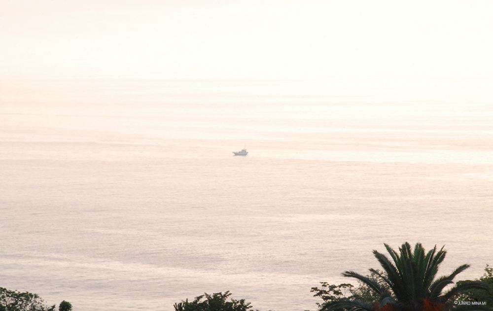 写真は、相模湾の朝陽に浮かんでいた船。
