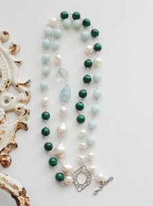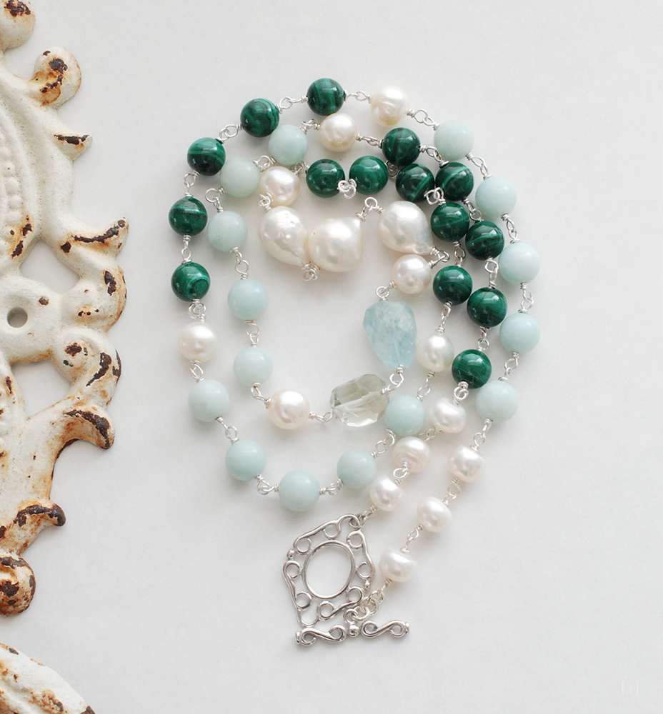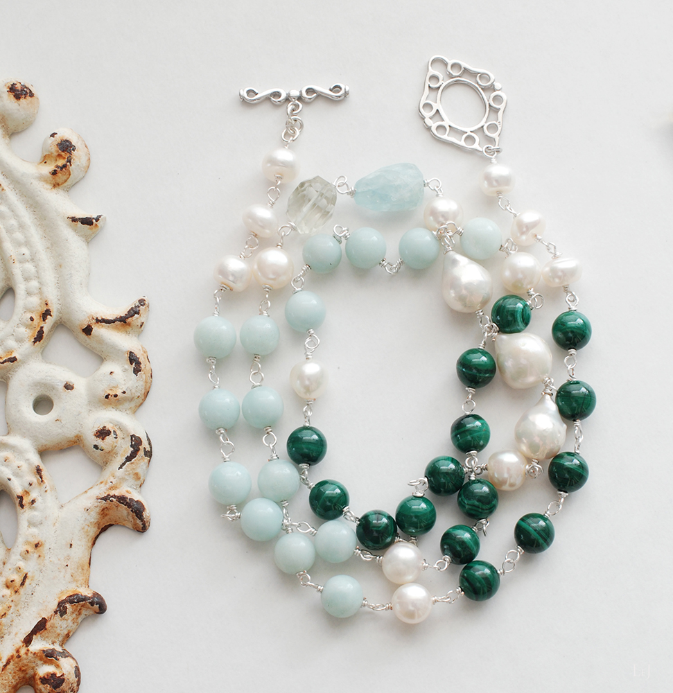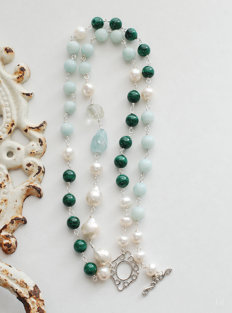 マラカイトと有核バロックパール、アクアマリンを使ったネックレス Margot は、いまお薦めしたいジュエリーです。