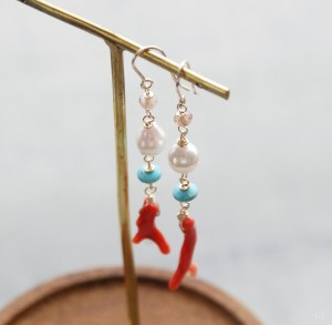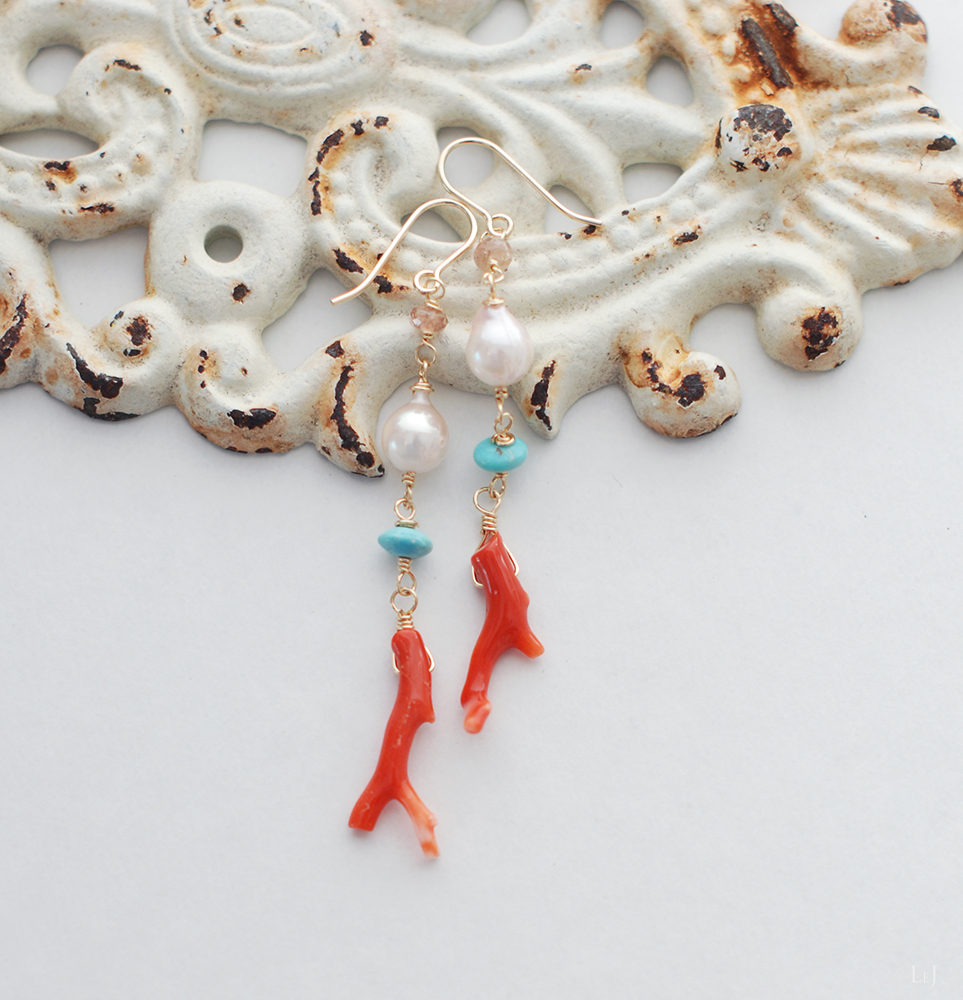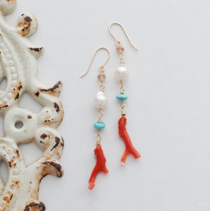 イタリア産コーラルとアリゾナターコイズ、アコヤパールに小さなサファイアでやわらかさをプラスしたピアス Amalfi57 を製作、ONLINE STOREに公開しました。