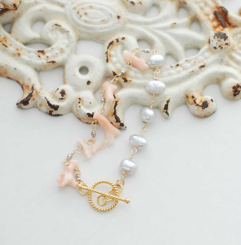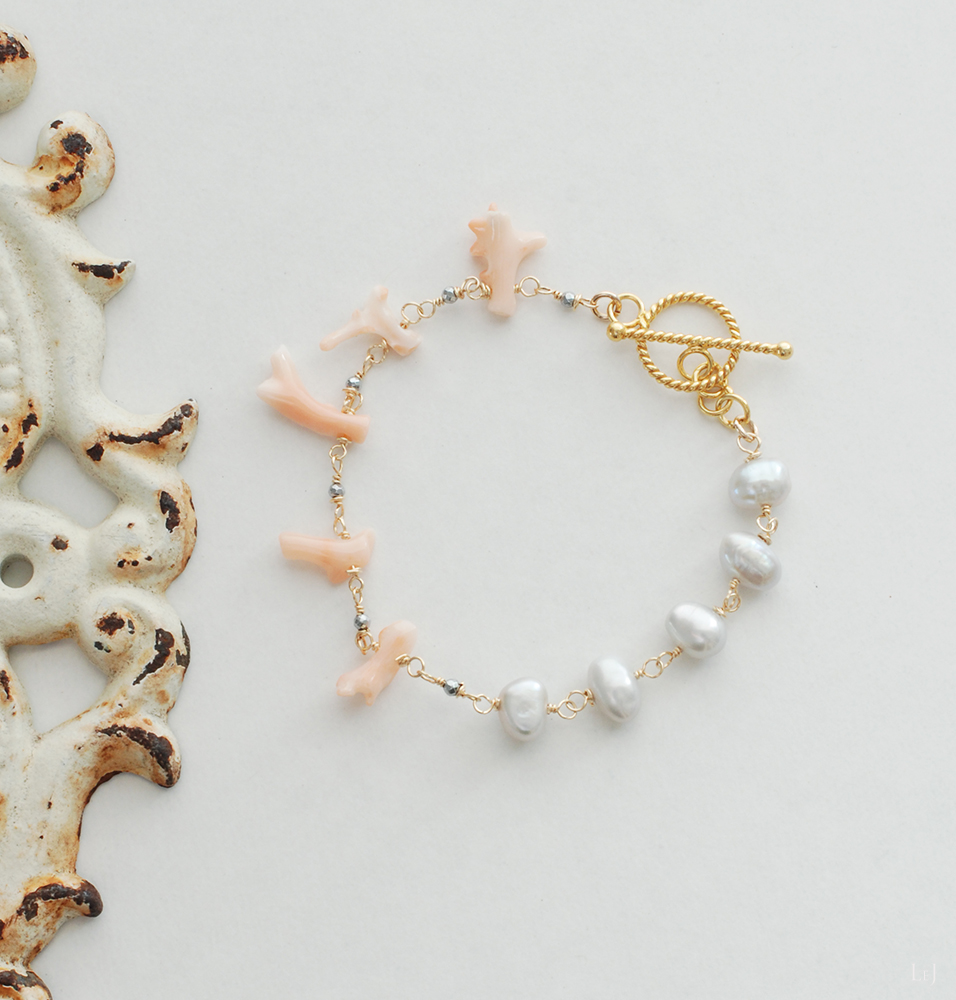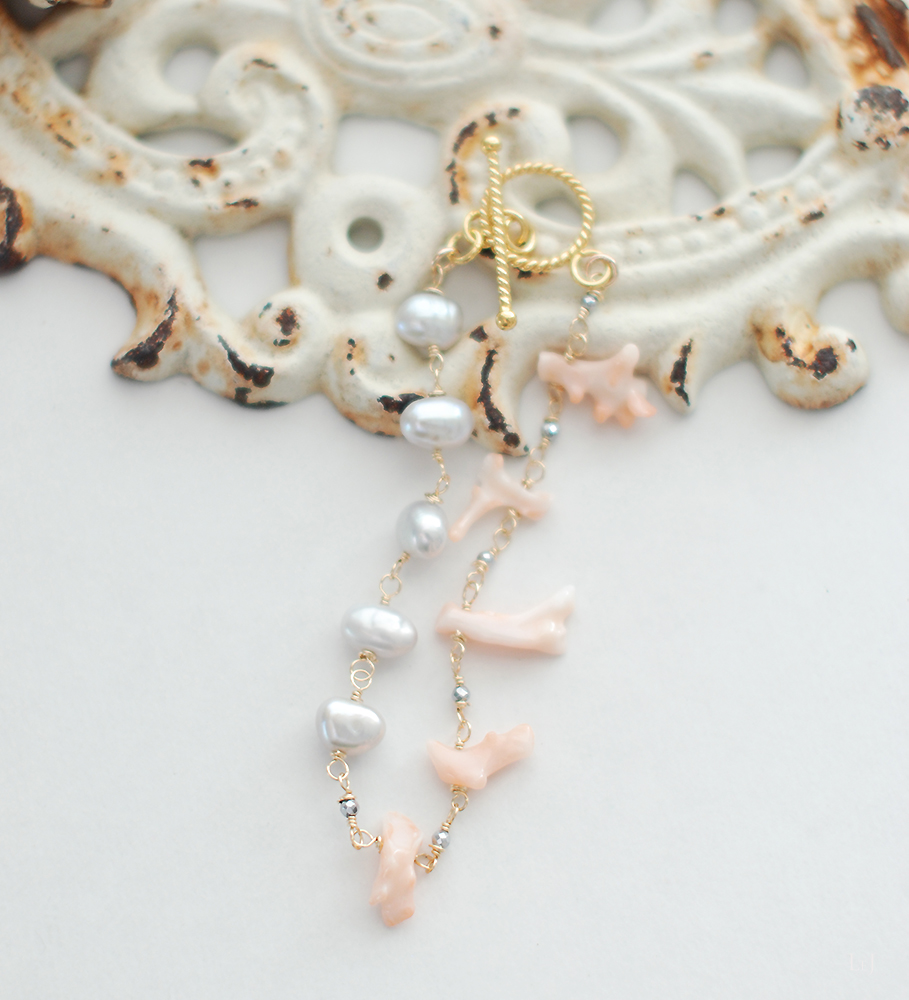 優しいペールピンクのブランチコーラルは、活き活きとしたシェイプ。その力強さとsweetnessがペールグレイのパールと出会って生まれた素敵なブレスレット Amalfi61 を製作、ONLINE STOREに公開しました。