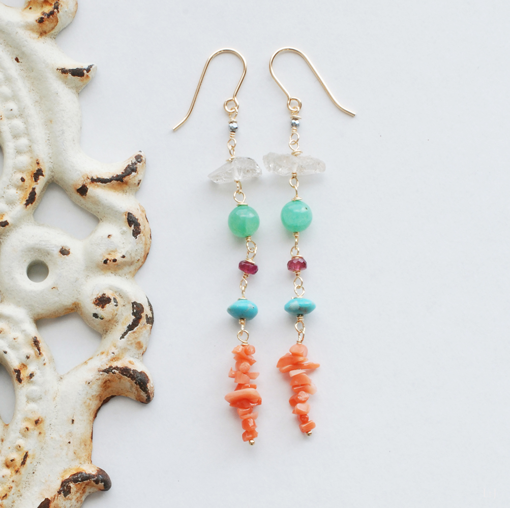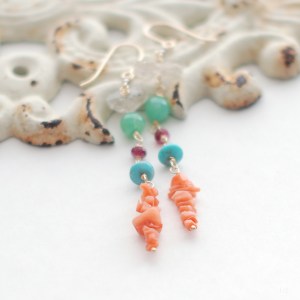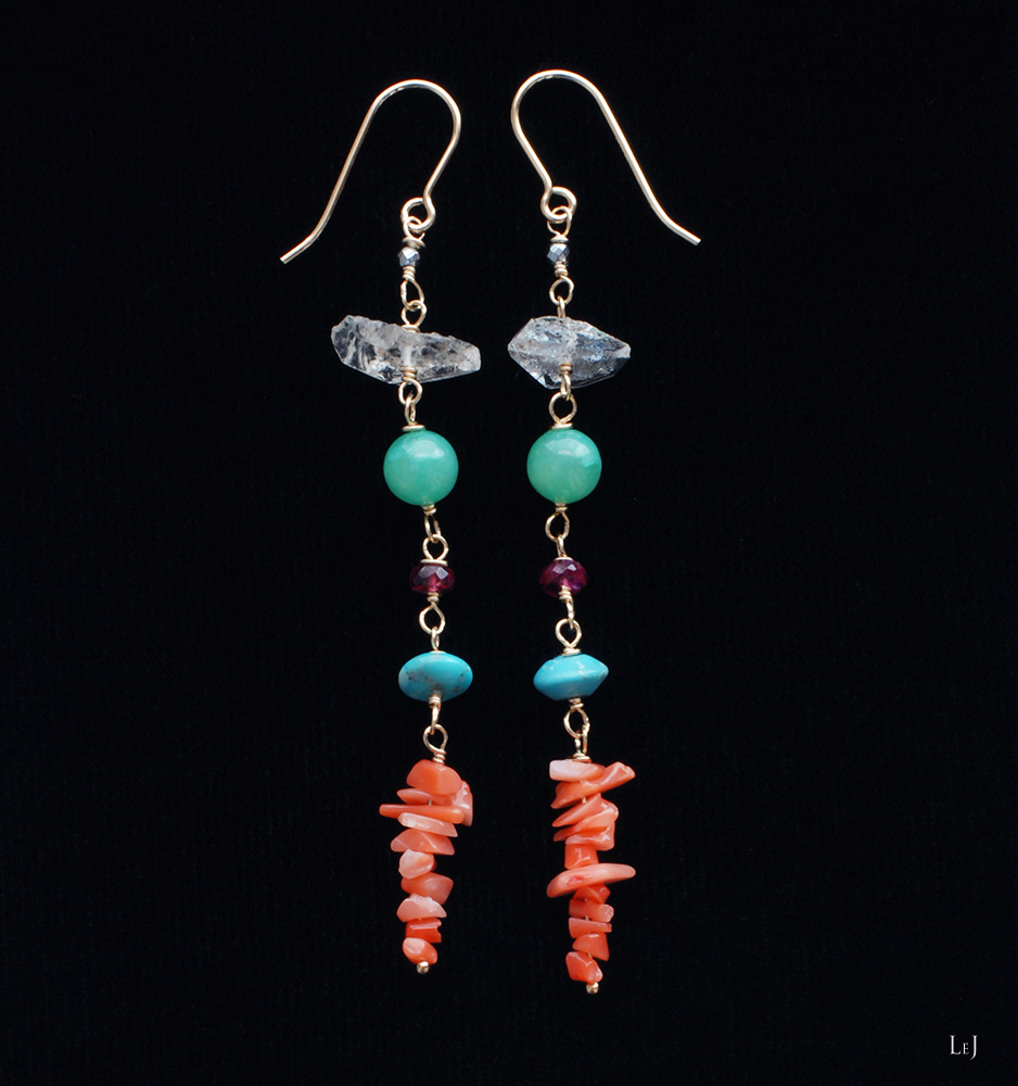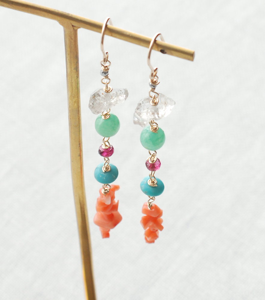 シルバーパイライト、ハーキマーカットクオーツ、ヘミモルファイト、ピンクトルマリンとアリゾナターコイズ。祝祭感に溢れた色ながらも、珊瑚のナチュラルな色彩が落ち着きを添えています。