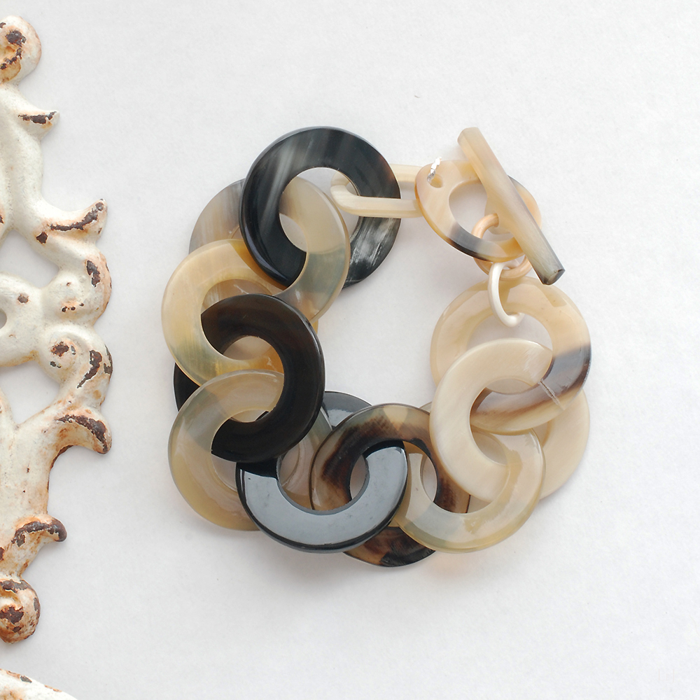 ホーン素材はその色調もあって、パールやターコイズやカーネリアン、どんな素材とも仲良くなれます。シルバー925と合わせるとまた違った表情を見せます。内径15,5cm〜16cmのかたにほどよいゆとりで着けていただけます。ニットを着る時期になれば、袖の上にしても素敵で、着けていることを忘れてしまうほどに軽いのが特徴です。