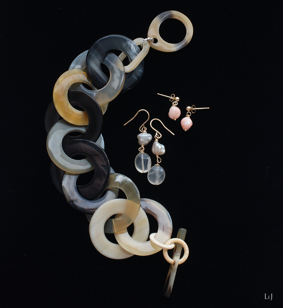 自然のままのかたち、あたたかみのあるベビーピンクがなんとも愛おしいジュエリーです。バングルのようなブレスレットに小さなピアスを合わせて、ブラックのセーター。
