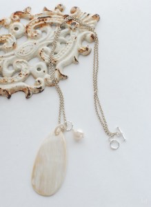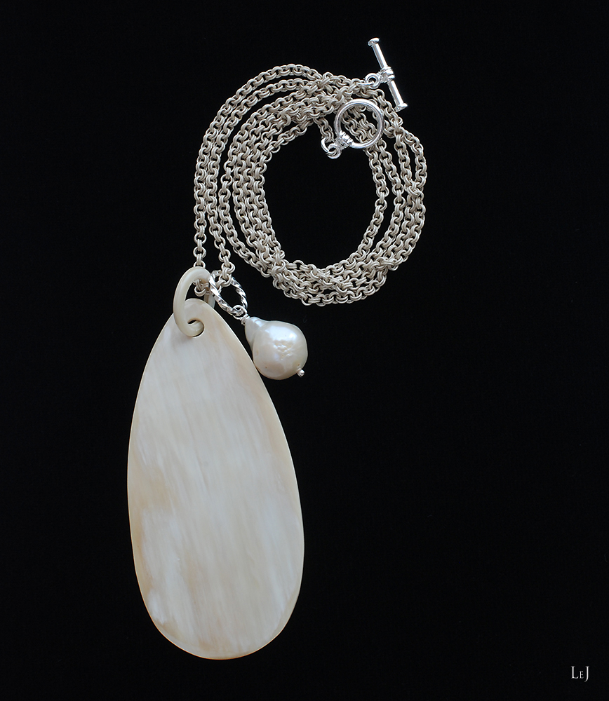 アンティーク加工ブラスのチェーンに、ホーンビーズと有核バロックパールでシンプルなネックレスを作りました。縄状のシルバー925リングに付けたパールは取り外しが自由で、お手元のパールのネックレスとの重ね付けなどコーデが拡がるジュエリーです。