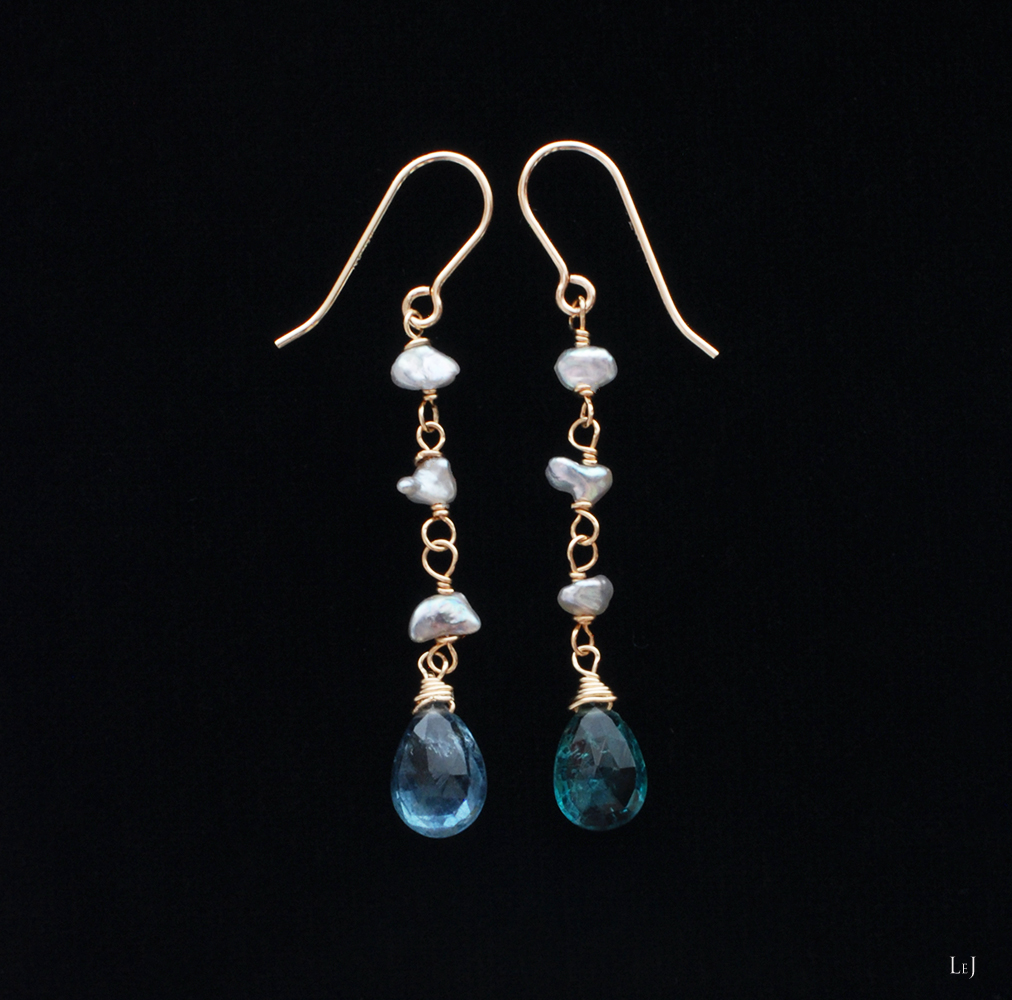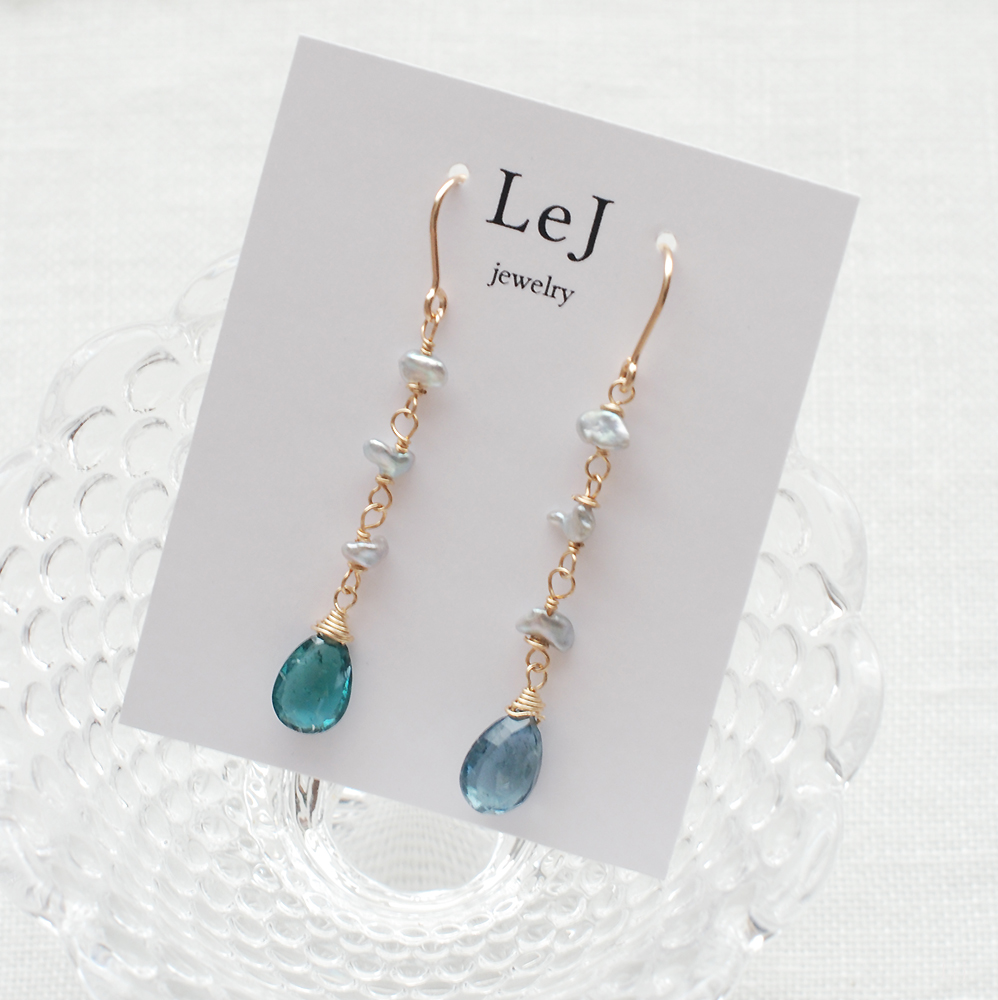 トルマリンはブルー、グリーンとの中間色にグレイをひとふりしたような、独特なミドルトーン。素晴らしいカットのぷっくりとした美しい粒を使いました。端正でクールで温かみもあるジュエリーに仕上がりました。細番手のニットによく合いそうです。