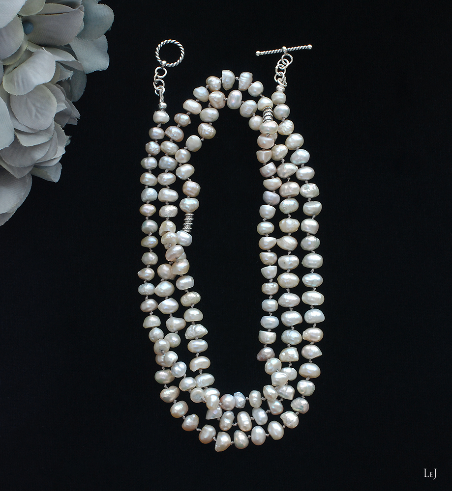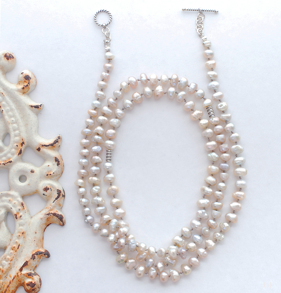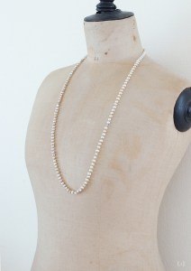 薄手のトップスにもニットにも、パールをひとつぶずつ結び留めているので自然なアールを描きます。重ね付けもどうぞ。