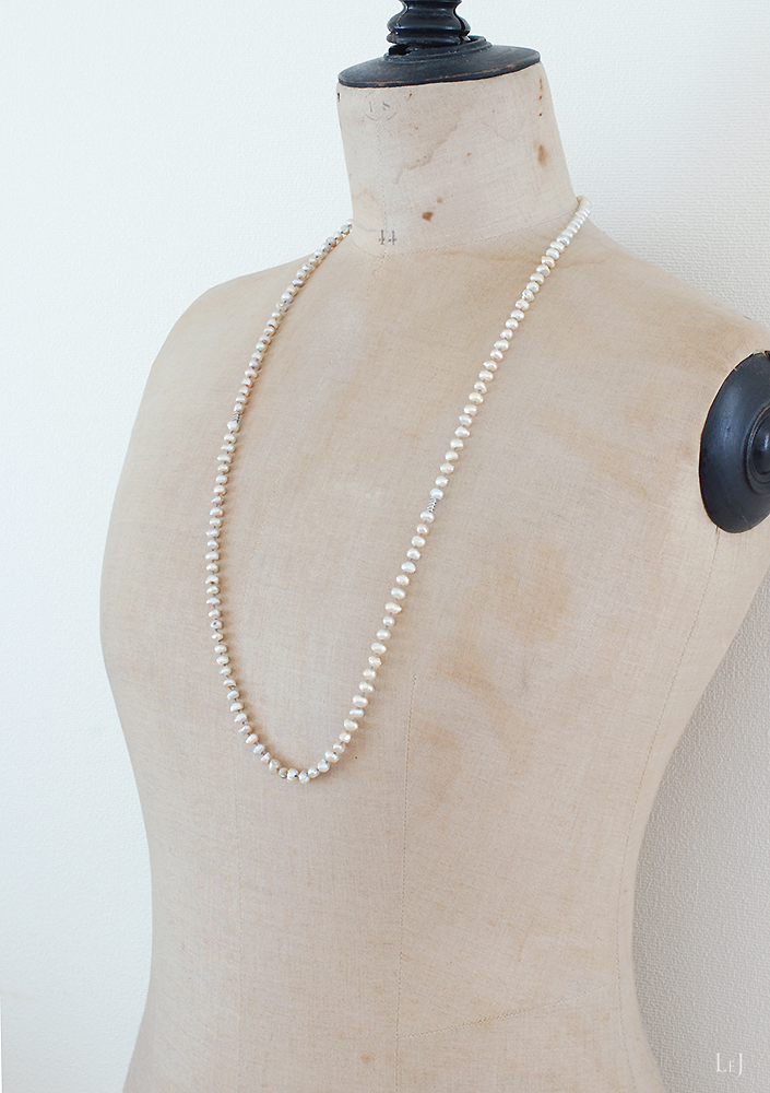 パールの表情がとても愛らしく、コーデにすっと馴染むようなジュエリー。ラインの途中にクラシカルなシルバー925のシリンダーパーツを入れて落ち着きを加えました。85cmの長さで、二連にしてもお使いいただけます。