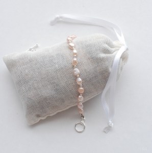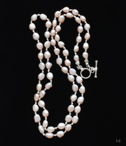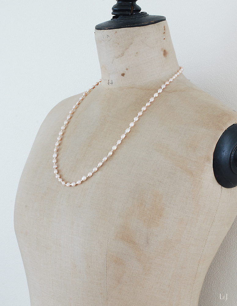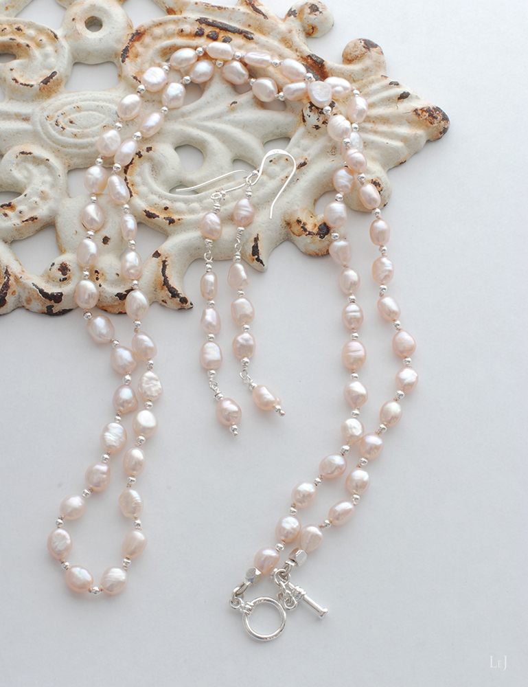 ネックレス・ピアス・ブレスレットを作りました。シルバー色のパーツがほどよく甘さを調節して、大人の女性のデコルテによく合う仕上がりです。ネックレスは長さ64cm。一粒ずつを結び留めているので自然なアールを描きます。ブレスレットは内径15cm。ピアスはホールからの長さ71mm。
