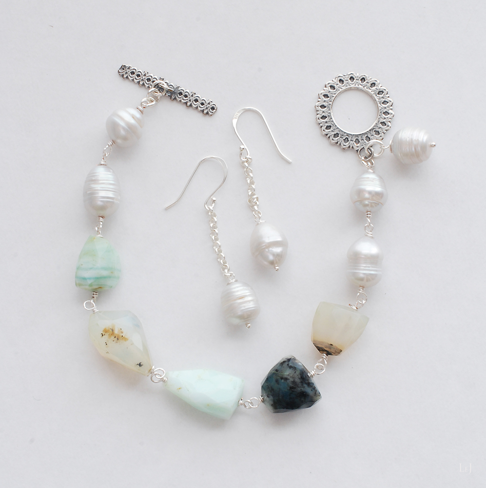 オパールはいろいろなものを内包していて、その美しさに人が憧れて、素材としてジュエリーに採り入れています。ダイヤモンドやパールのように輝かなくても、そこにいるだけで温かみを感じる人のようです。とくにブルーオパールはとても好きで、サイトを設立した頃からずっと使っています。ビーズ業界にもトレンドのようなものがあるけれど、ブルーオパールがトレンドと言えるかどうかはかなりあやしいところです(笑)LeJはおそらく、そのトレンドや流行とはまったく無縁のところにいます。