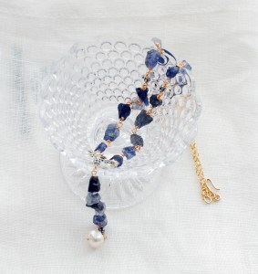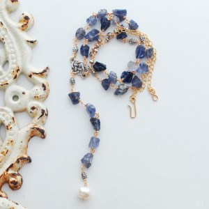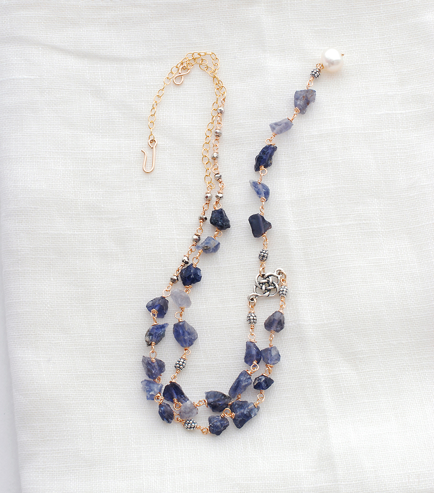 ラフタンブルカットのアイオライトをネック部分に、クラシカルなシルバー925パーツを配して、デコルテの部分には静けさのなかに光る星のようなパイライト。