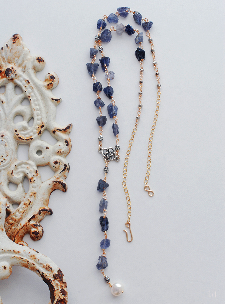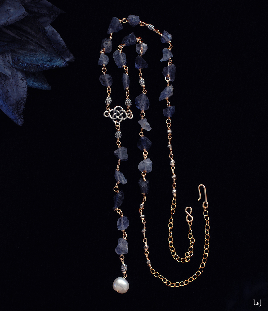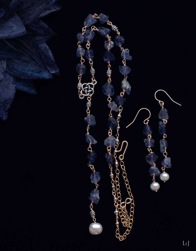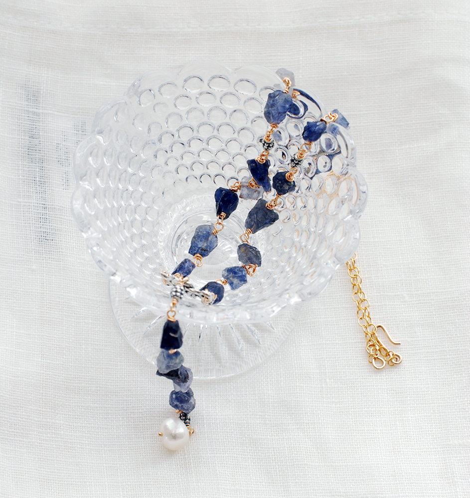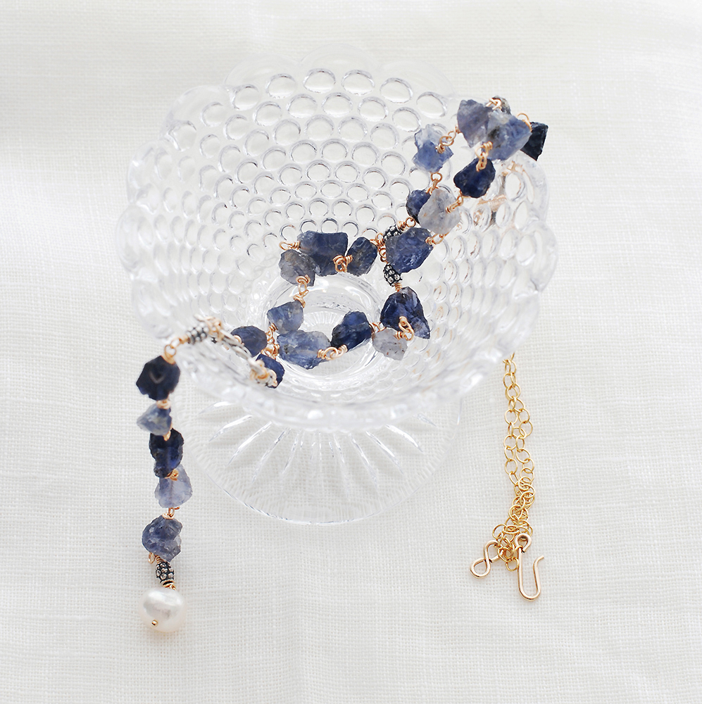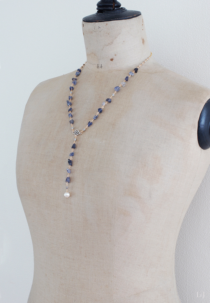 アイオライト独特の儚げな光は温かみを湛えています。一粒だけ使ったハイクオリティ淡水パールがやわらかなライティング。撮影がとても難しいアイオライトは、このカットがもっとも美しいと思います。