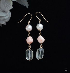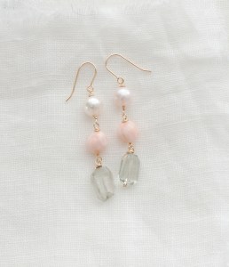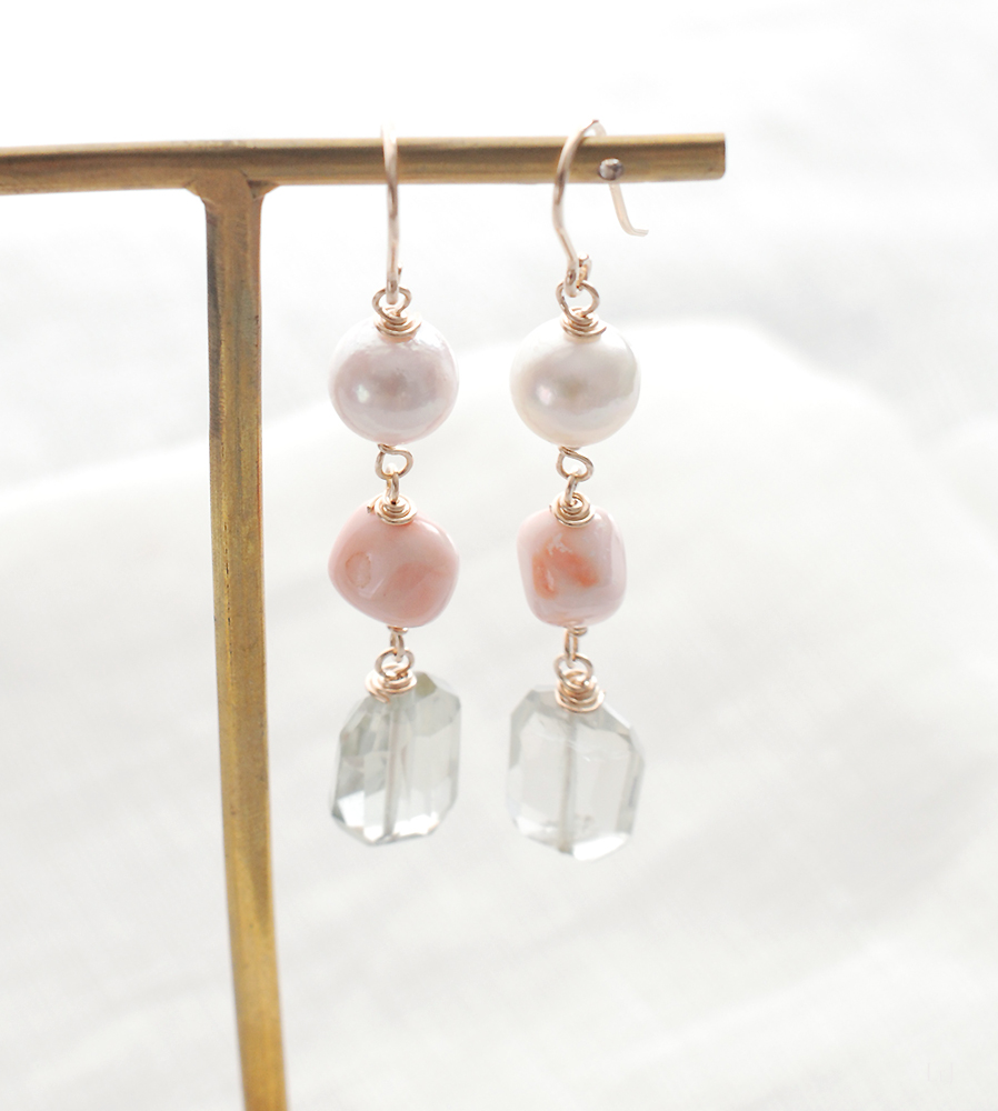 このデザインでパールのバラエティを替えて何点か作って来たのですが、久しぶりに大きな粒の素材ばかりを使いました。アコヤパールは⌀8mm、ピアスホールからの全長60mm。このような愛おしさ溢れるピンク色のコーラルのストックはほとんど増えることがないので、使うときにはやはり好きな色と合わせたくなります。