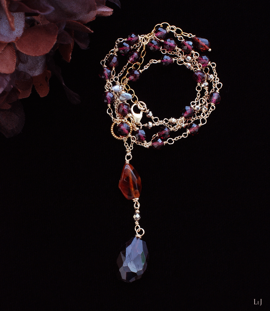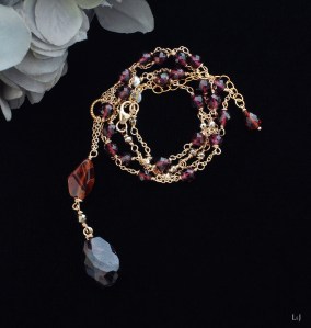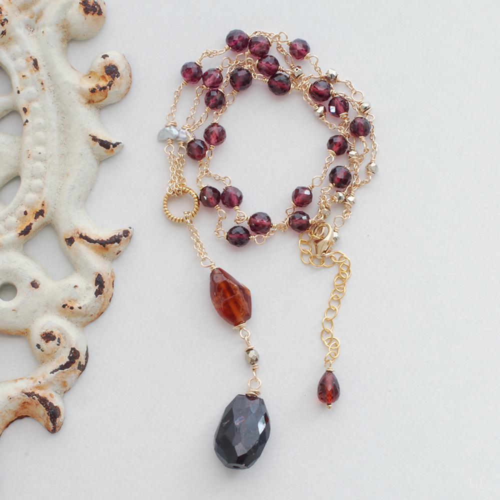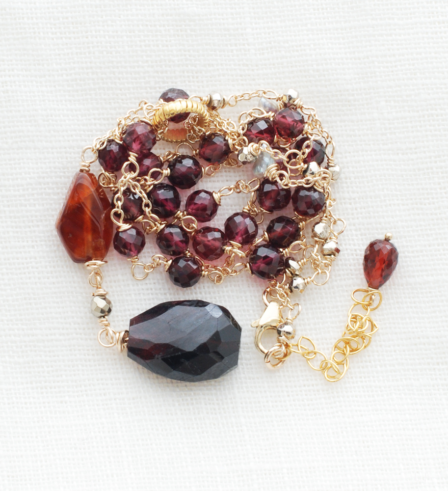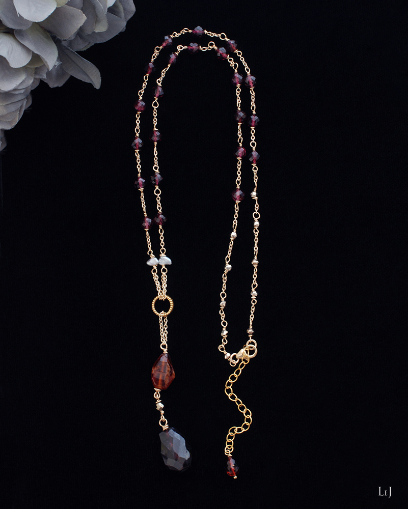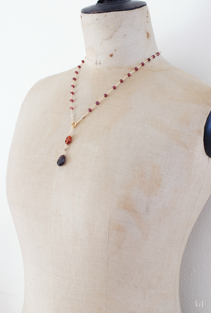 長さは51cm+5cmのアジャスター。アジャスターの先にはモザンビーク産ガーネットを使いました。リングから下の長さは66mm。シンプルなニットによく似合います。