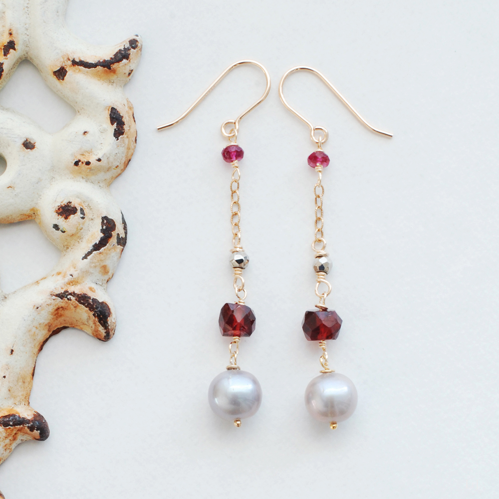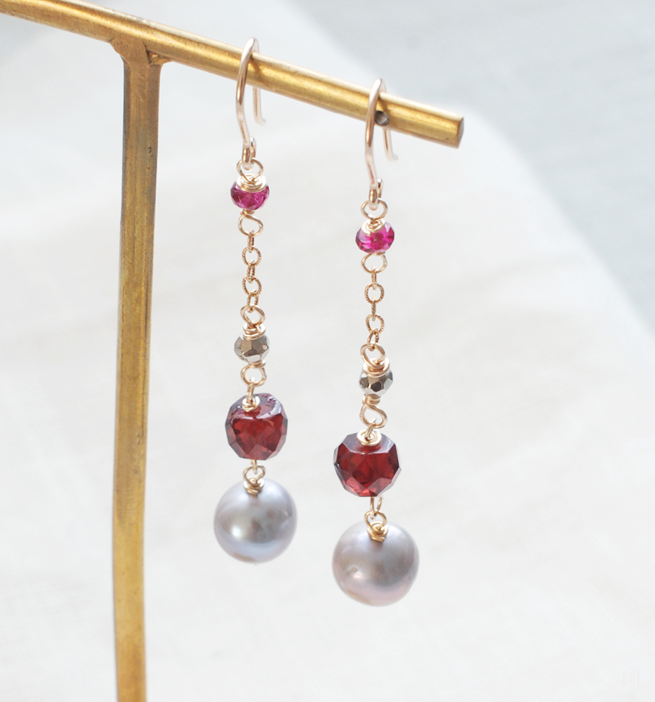 ピアスパーツのすぐ下にはピンクトルマリン。シルバーパイライトからガーネット、そしてアコヤパール。