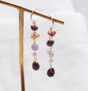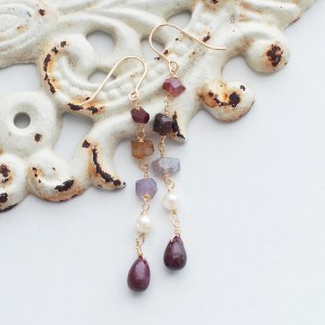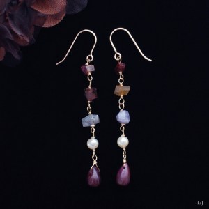 絶妙なミドルトーンのサファイアと、アコヤパールのクリーミーホワイト、バーガンディのルビーのブリオレットで作ったピアス Lia22。