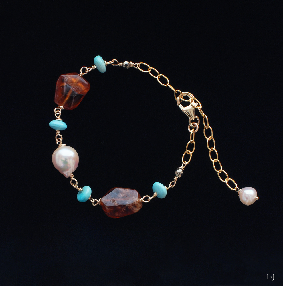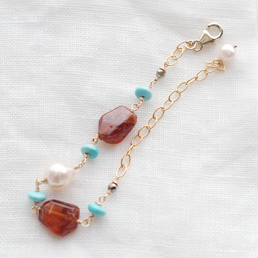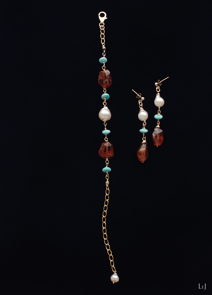 素材:モザンビーク産ガーネット・スリーピングビューティターコイズ・アコヤパール・K14ゴールドフィルド