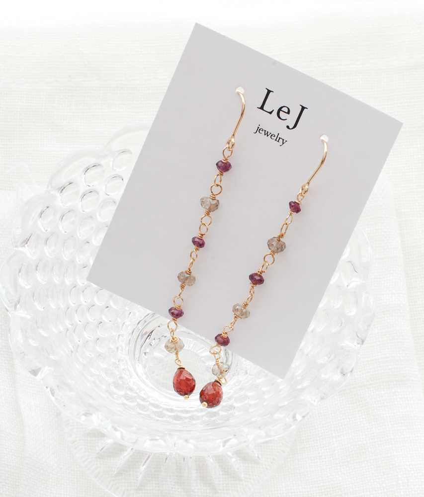 LeJ(ルジィ)ではキラキラしたジュエリーに限らず、天然石素材も10数年前のものから最近買ったものを一緒に合わせたりと大人の女性が楽しみながら安心して選べるようなものを作りたいと思っています。小さな粒のガーネットとラブラドライト、一番下にはモザンビークガーネット。
