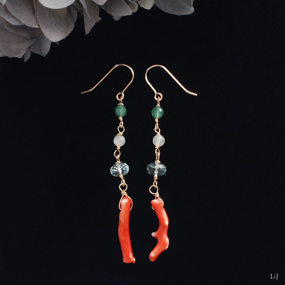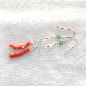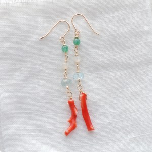 パーツの下から、グリーンクオーツと50年前のデッドストックのホワイトムーンストーン、繊細なカットのアクアマリンと合わせました。枝珊瑚はイタリアのサルディニア産。このようなロングピアスは持っているだけでもなんだか愛おしくなる存在で、ふだんは出番がないというかたにも、たとえば髪をカットしたときや季節が変わったとき、気分を変えてみようと思ったときに着けていただきたいジュエリーです。きらきら、ぎらぎらしない、自然が生み出したものがもつ、独自の魅力を持ったジュエリーです。