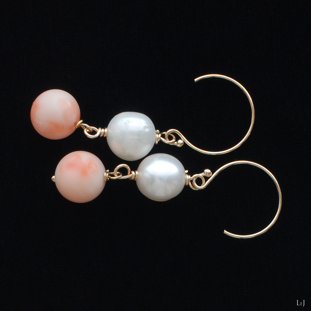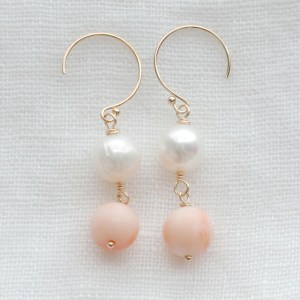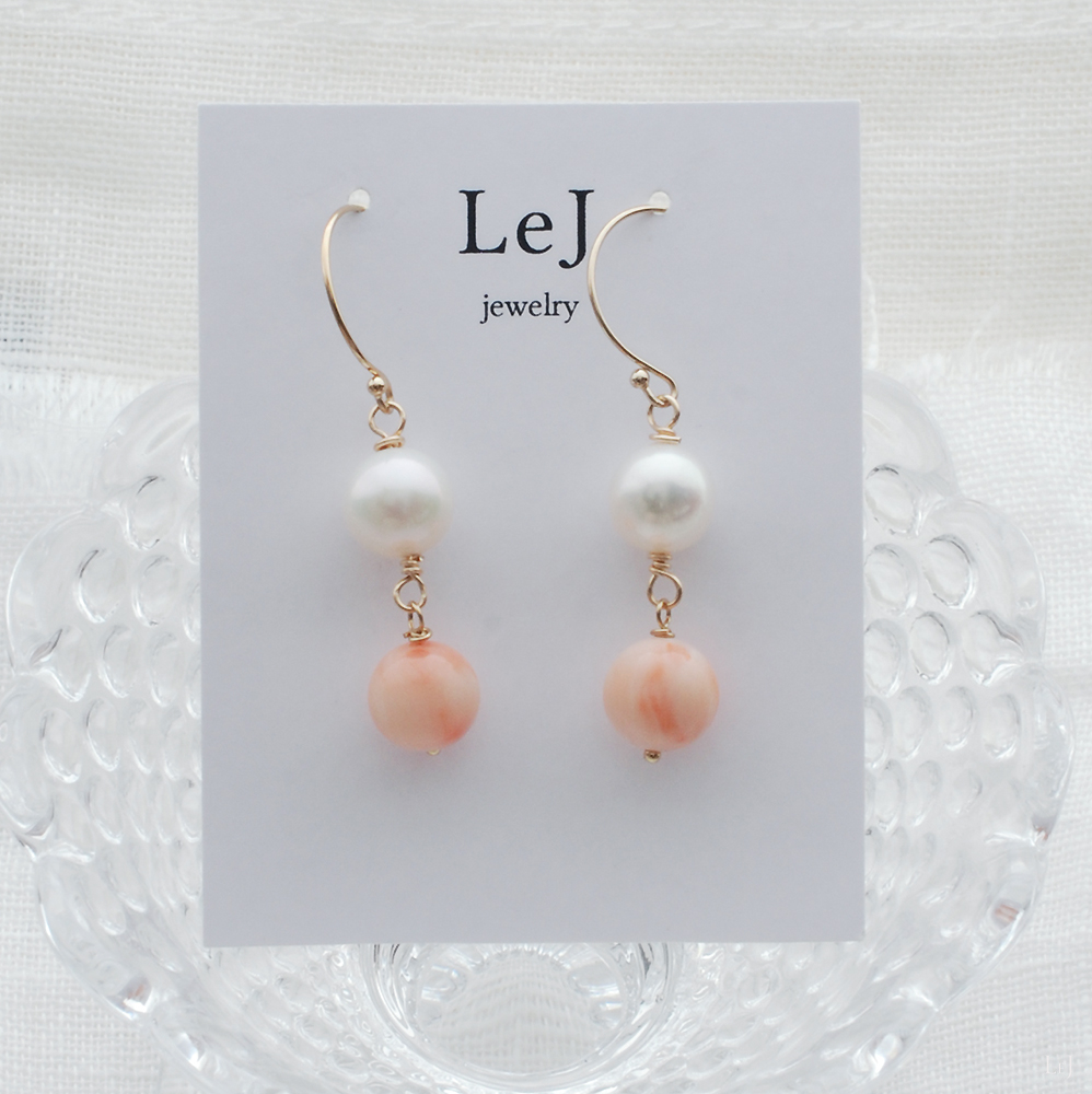 コーラルピンクと硬質的なかがやきのハイクオリティ淡水パールのピアスです。どうぞご覧ください。
