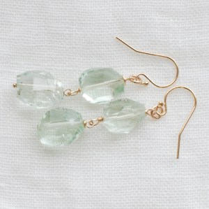 グリーンアメジストのほのかなグリーンは気品に溢れていて、そして日本人のオークル系のお肌によく馴染む色。ふた粒使って、丁寧なハンドカットの美しさと儚げなトーンをシンプルに活かしました。
